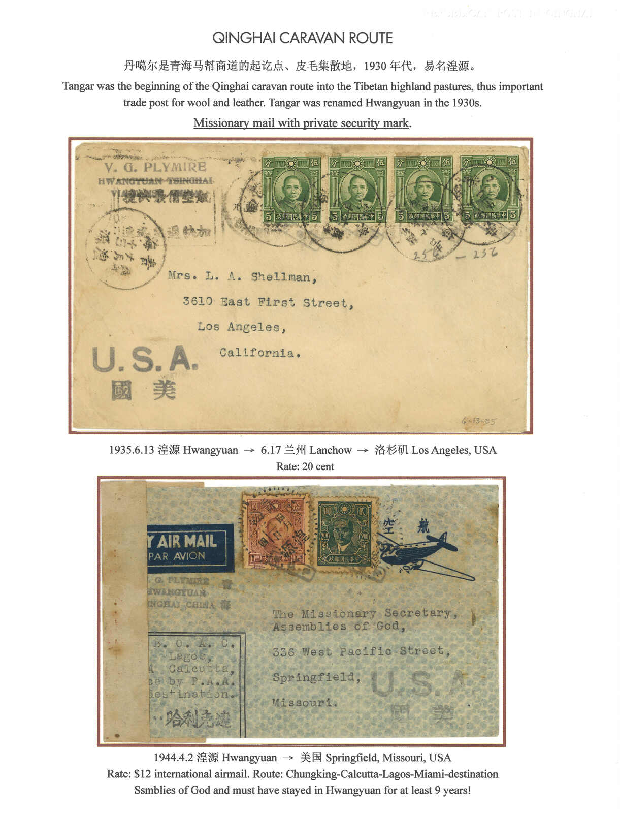 1935 and 1944 a pair of covers from Hwangyuan to USA, f.w. SYS issues, tied by Tsinghai Hwangyuan type 6 cds. Tangar was renamed Hwangyuan in 1930s.