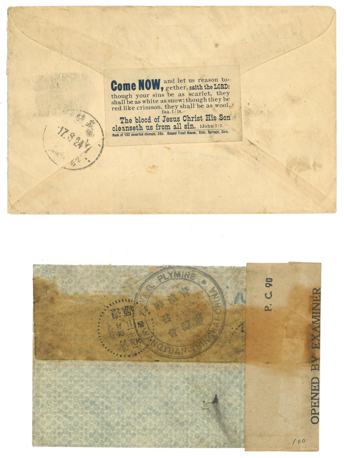 1926及1936年一對西寧寄出之檢查封,貼帆船及烈士票,銷不同樣式之西寧日戳。另分別見檢1型及5型檢查章。馬家軍於民國時期緊握青海軍政大權,並實施郵政檢查。(Image 1)