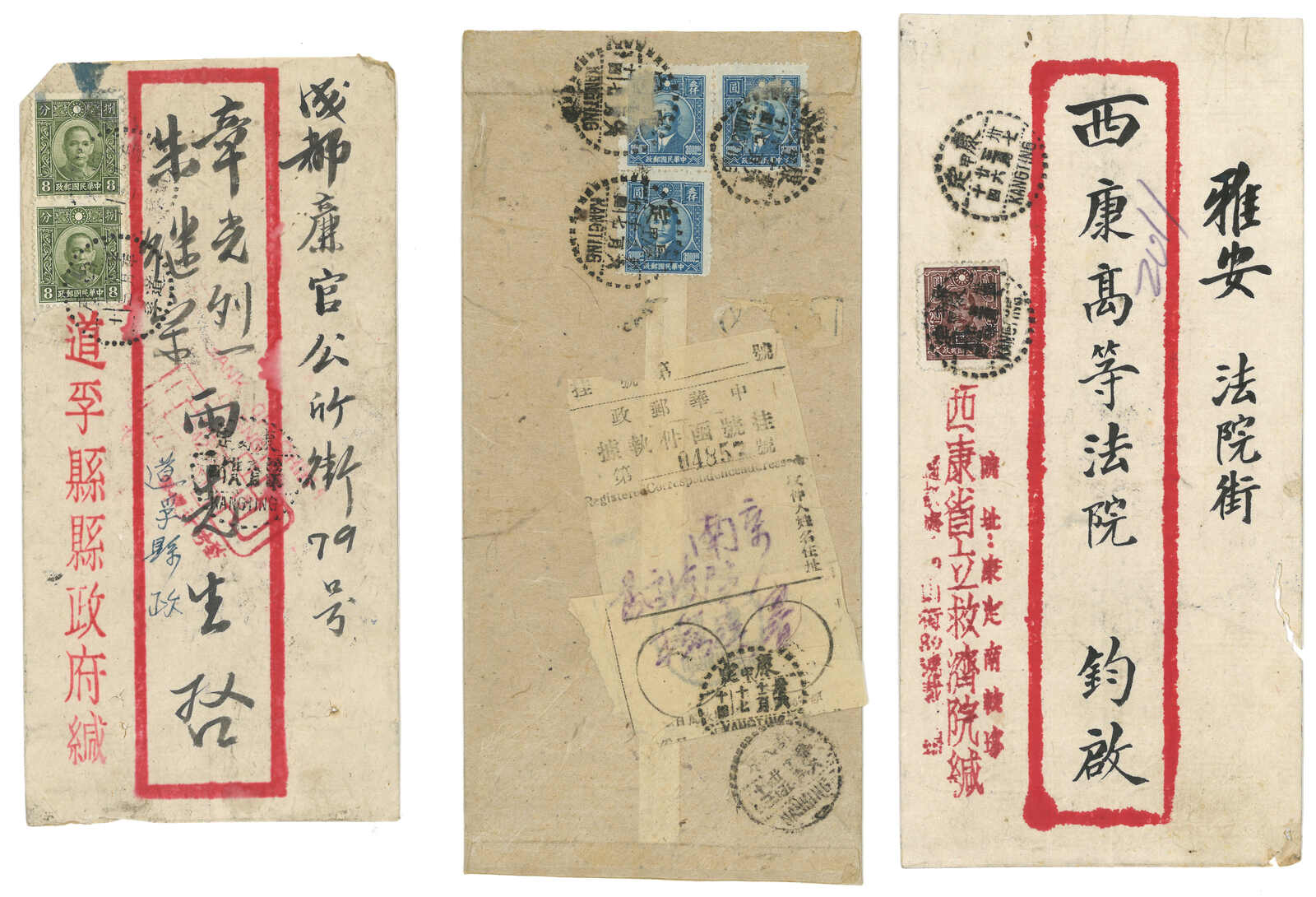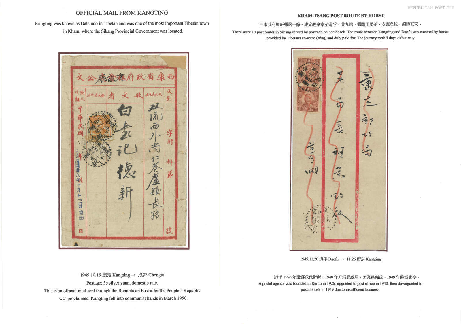 1940年代一組五件往來康定之實寄封,貼孫像、改值國幣及銀圓票。當中包含難得之災難封。兩件自小地名道孚。(Image 1)