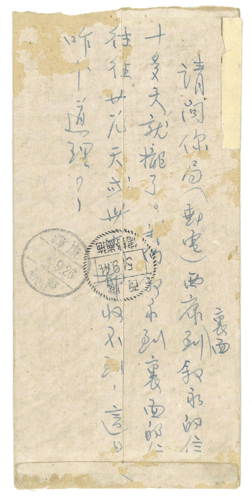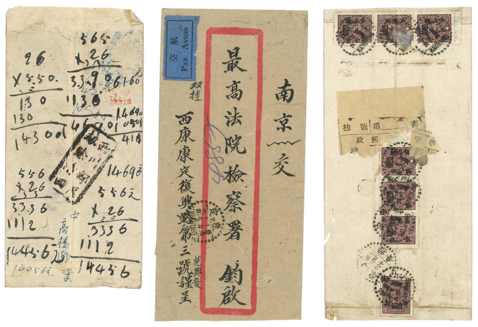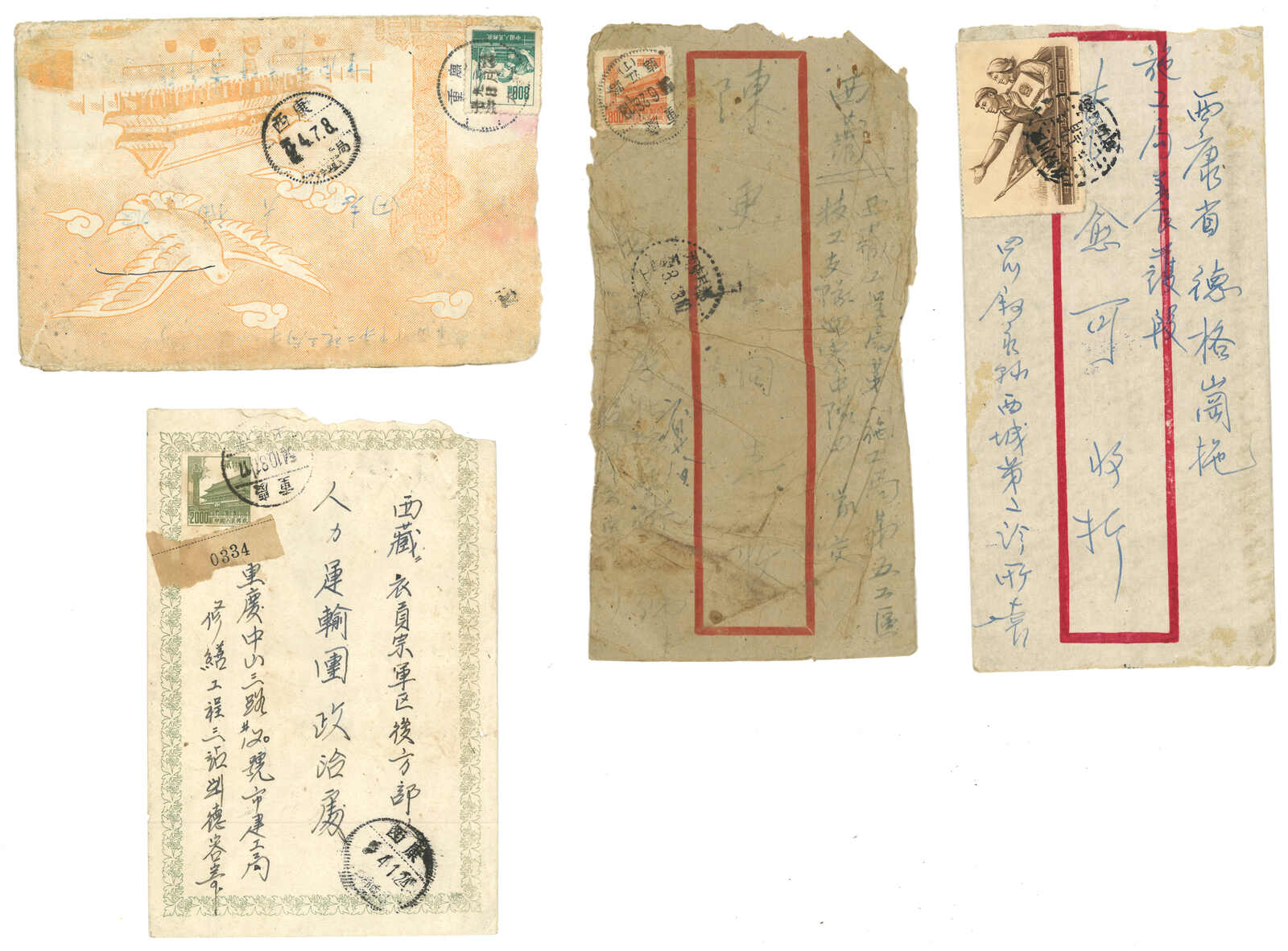 1950年代一組六件出自西康、昌都及四川之民郵及軍郵封,展示了各式郵戳及貼票。部分小地名郵戳難得少見。(Image 1)