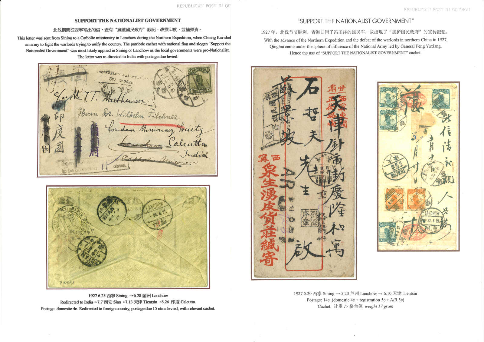 1927年一對西寧寄國內封,貼帆船票,銷西寧日戳。均見“擁護國民政府”宣傳戳。隨著北伐勝利,青海歸附馮玉祥的國民軍。(Image 1)
