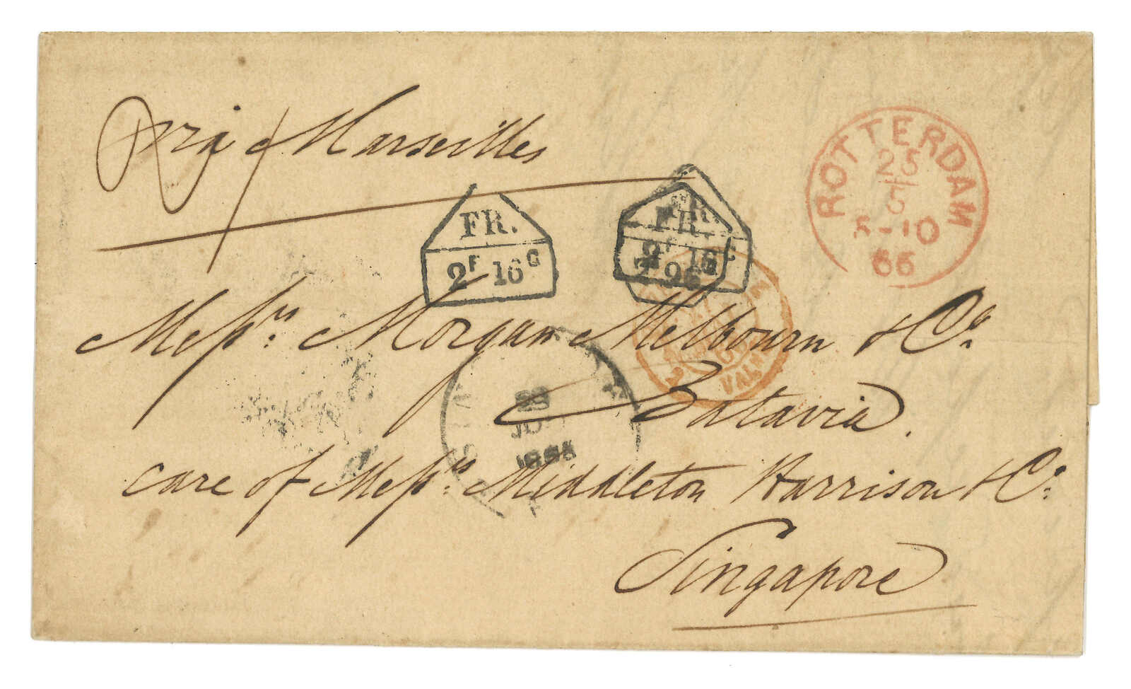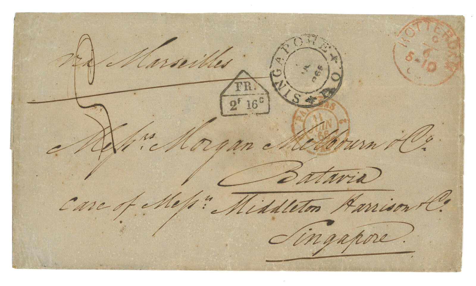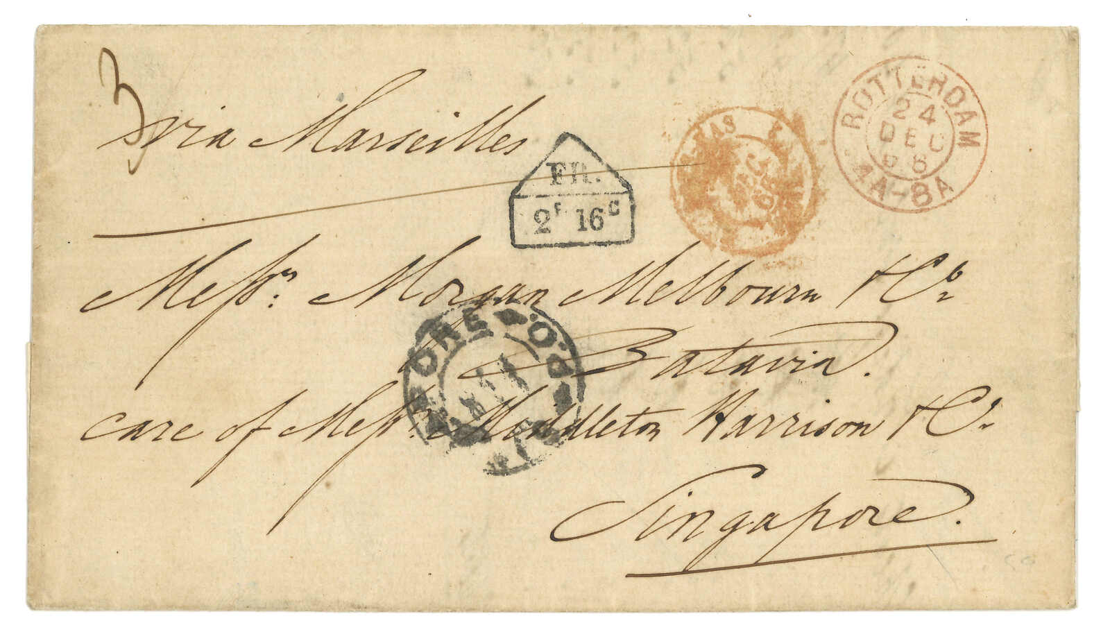 1854 Canton (9 Sep) to Cadiz, Spain via forwarding agent Michael Power in Gibraltar. Entire letter, rated “4” applied with scarce Webb type 1 “CANTON / PAID” double arc h.s. in orange on front and Webb type 2 “CANTON”