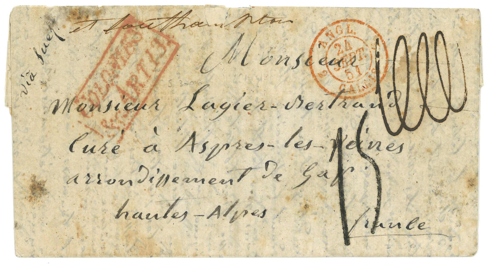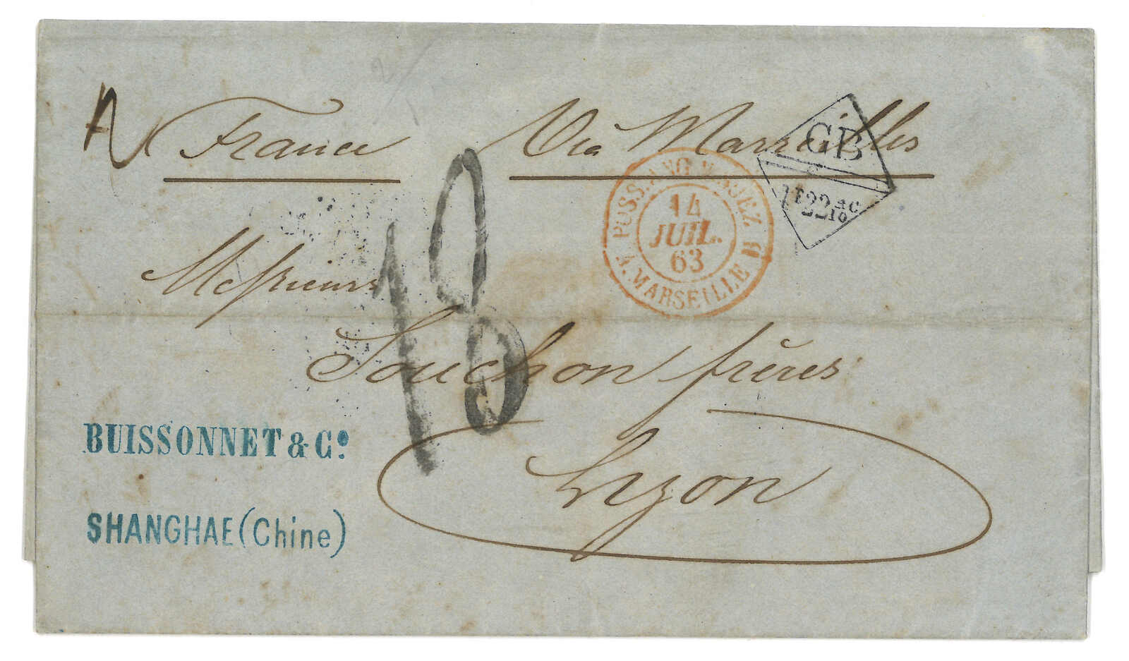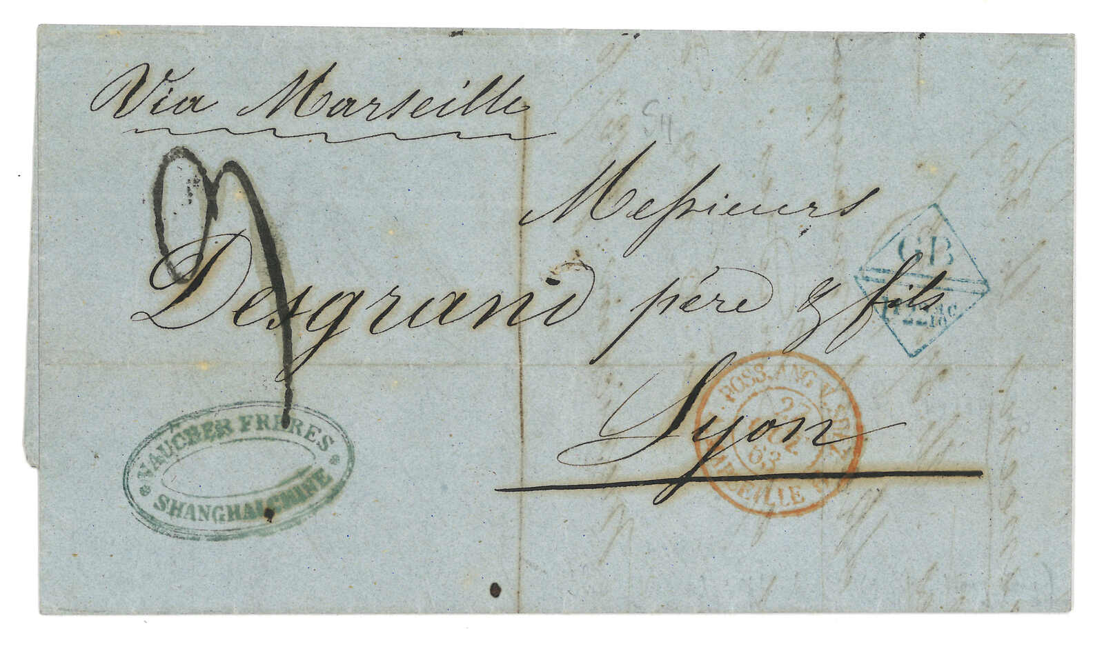 1854 Canton (9 Sep) to Cadiz, Spain via forwarding agent Michael Power in Gibraltar. Entire letter, rated “4” applied with scarce Webb type 1 “CANTON / PAID” double arc h.s. in orange on front and Webb type 2 “CANTON”