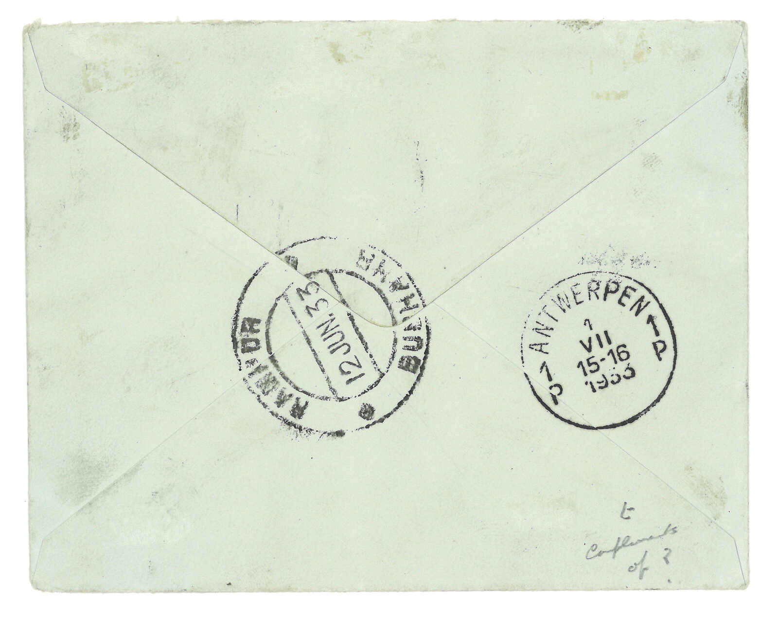 1940年Huge Richardson寄孟買Captain Gantz,貼西藏獅圖第三版票,銷拉薩戳記。Huge Richardson為 英國駐西藏代表團成員。據聞寄於1940年2月22日第十四世達賴喇嘛的儀式上。雖為集郵封,但極具歷史意義。(Image 1)