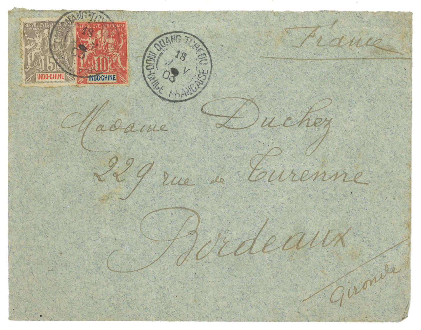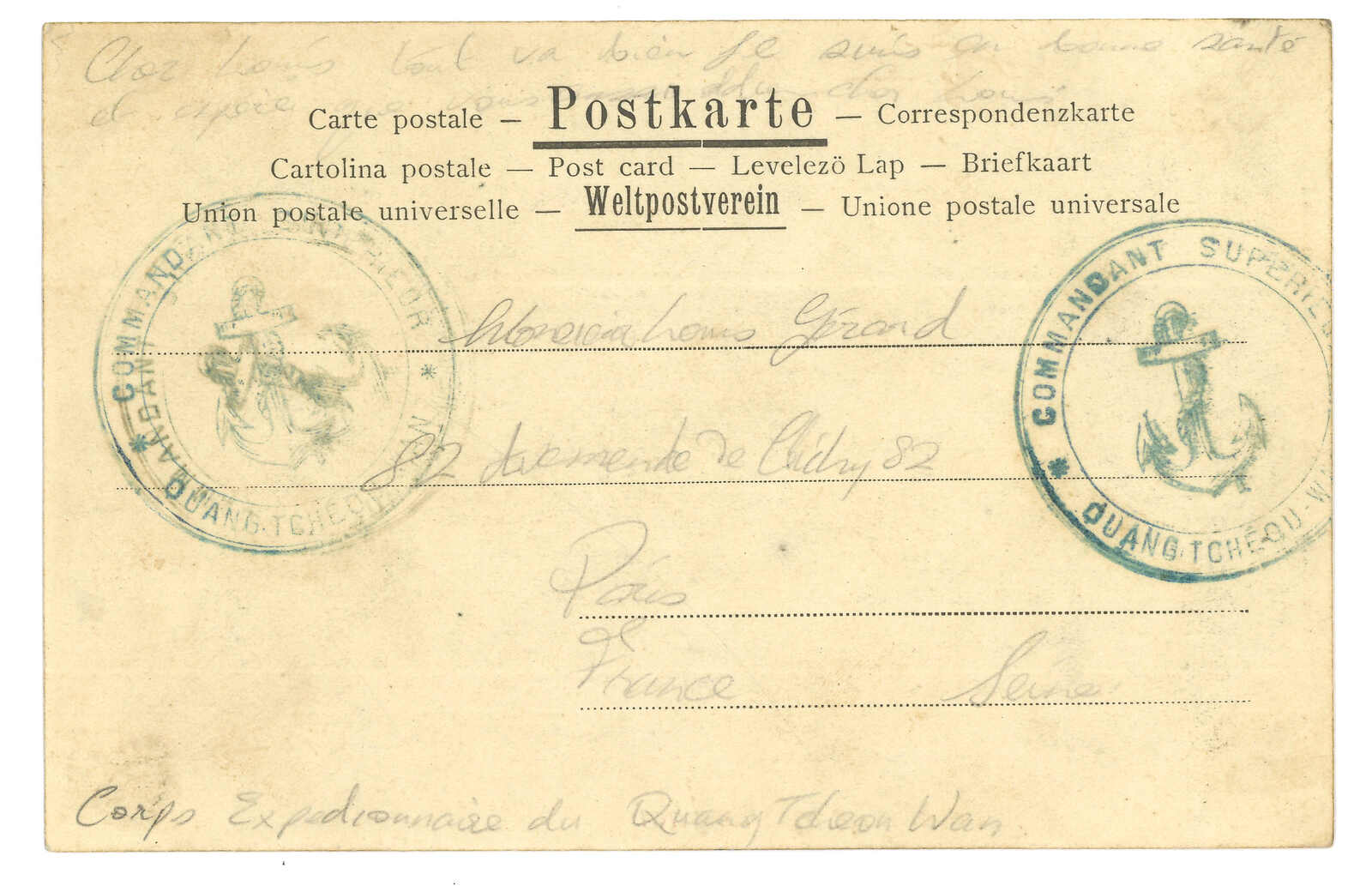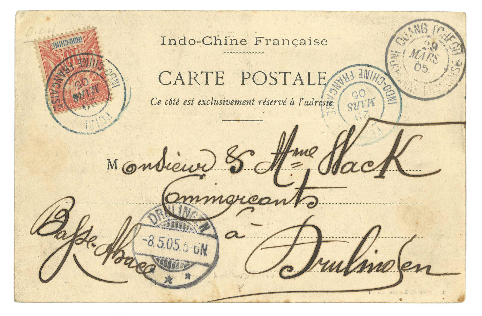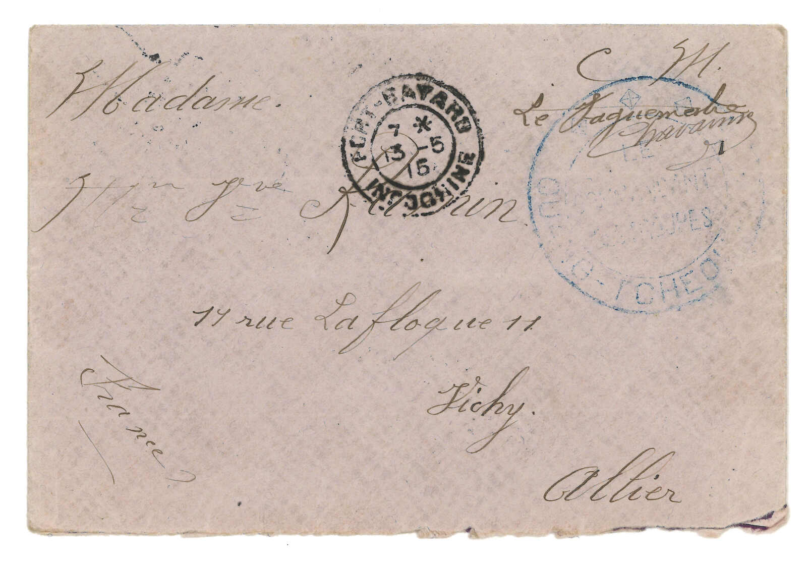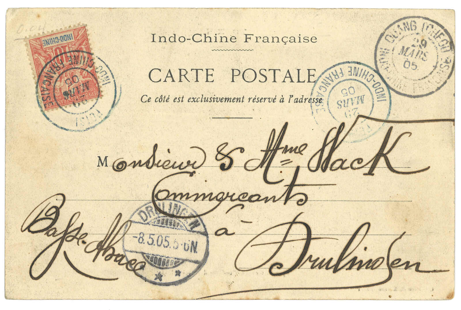 法國戰艦Tiger寄法國。對華遠征軍加蓋於馬達加斯加遠征軍信卡,當Salazie號離開西貢時鈐東京遠征軍5局10.1日戳,旁帶指揮官加簽。10.25抵法國。Salazie號送遞了首批由法軍寄出之郵件。存世之法國信卡例子不過數件。(Image 1)