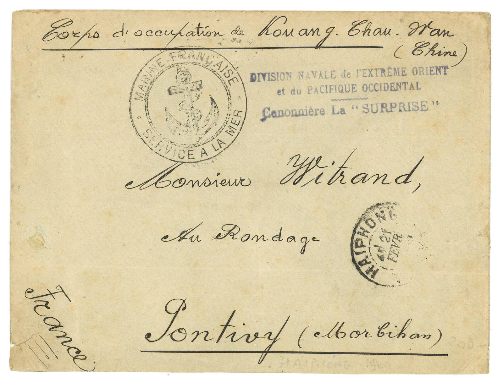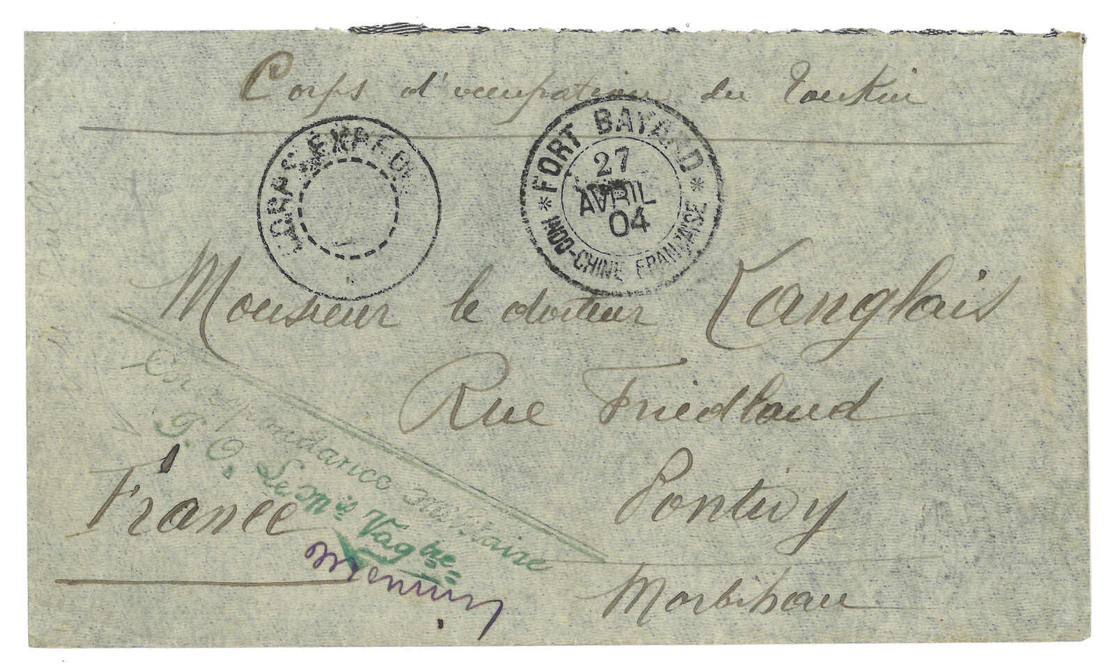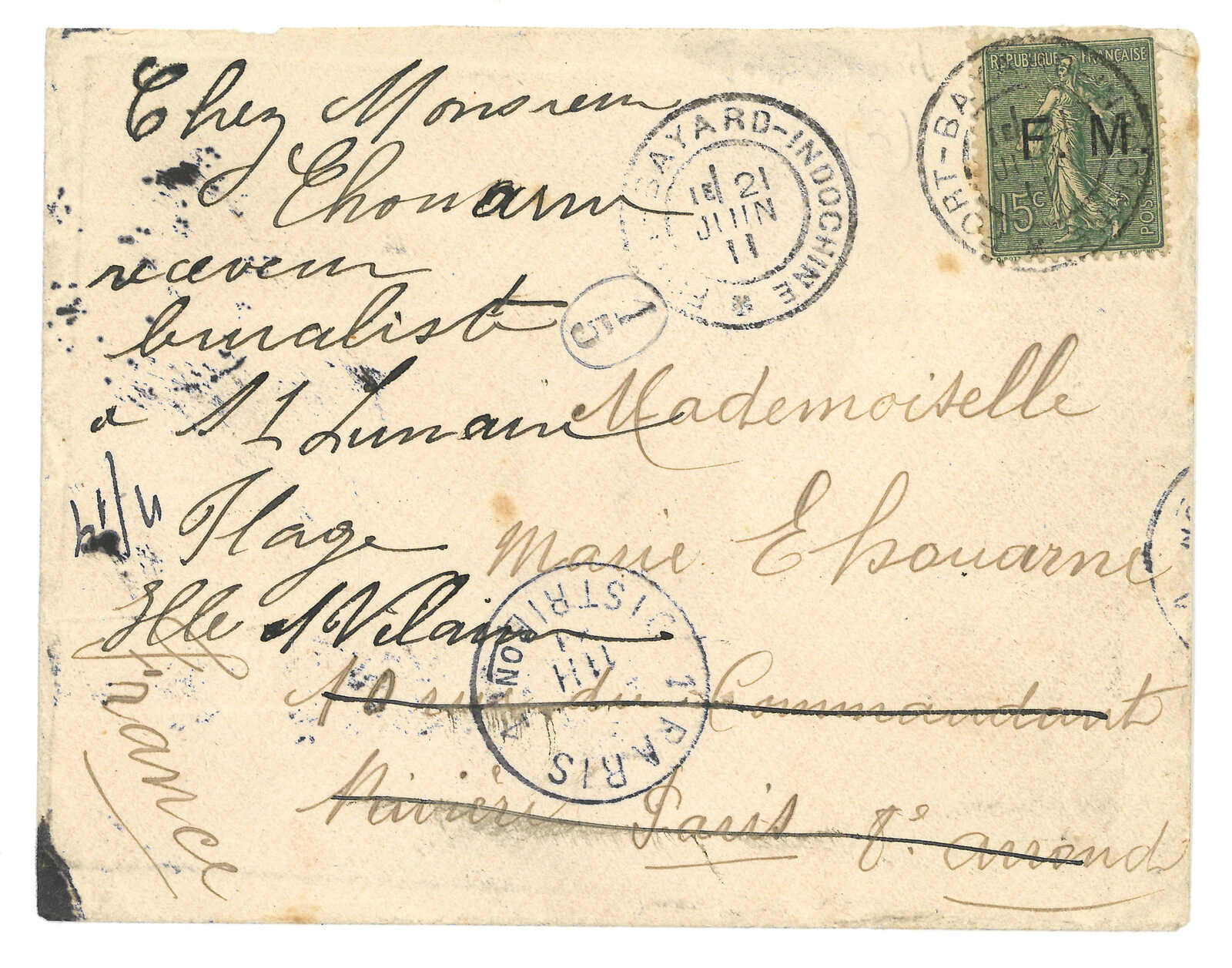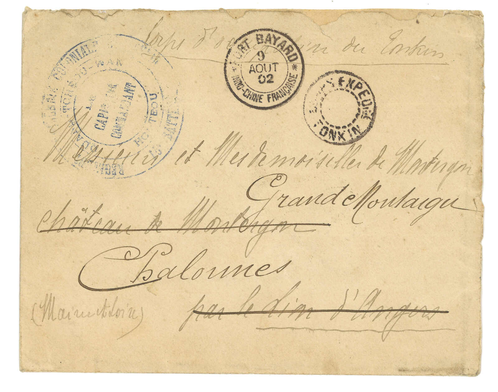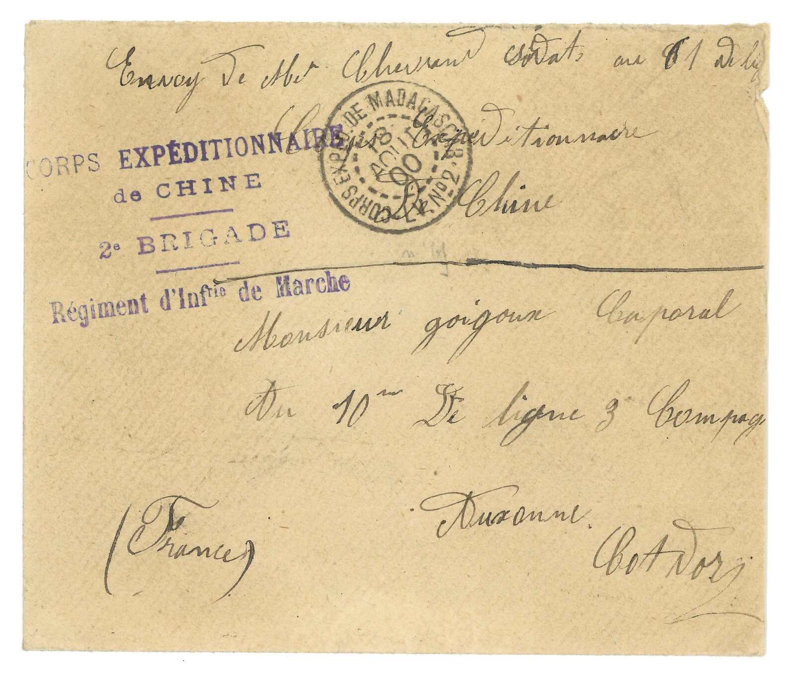 1900 (18 Aug) Corps Expeditionnaire de Chine cover to Cote D’Or, frankless, applied with “CORPS EXPED DE MADAGASCAR / LV No.2” cds and “2e BRIGADE / Regiment d’Infrie de Marche” rectangular mark. Arrived Cote D’Or (25 Aug).