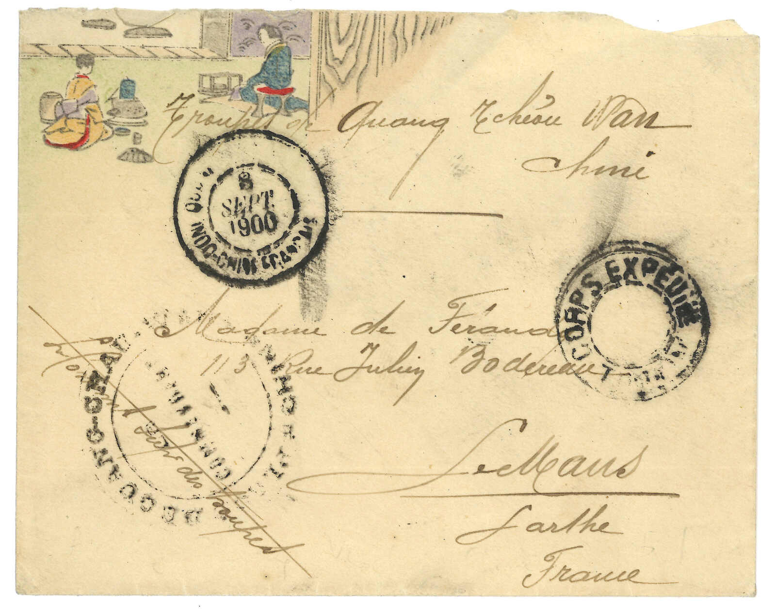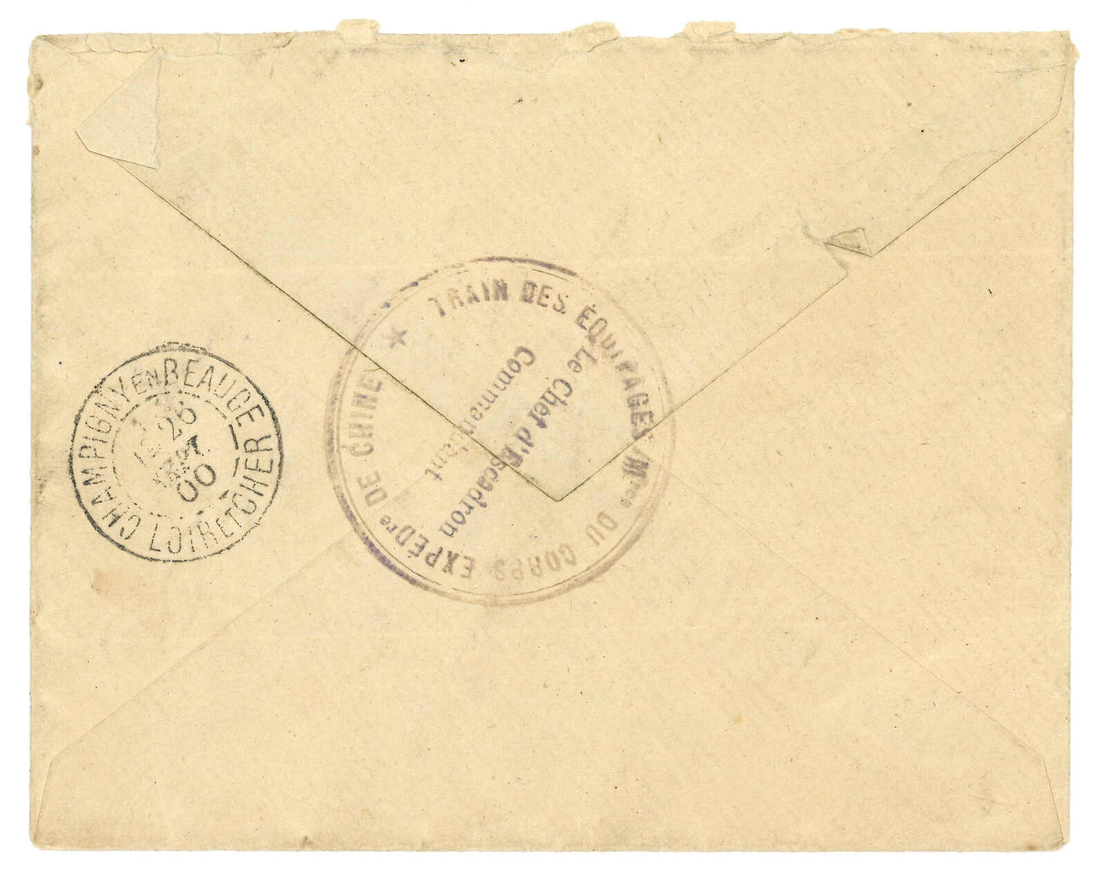 1900 (19 Sep) Corps Expeditionnaire de Chine cover to France, applied with French military PO (Tresor et Postes aux Armees) No. 4 cds. On reverse with “TRAIN DES EQUIPAGE Mres DU CORPS EXPEDre DE CHINE / Le Chef d’Escadron