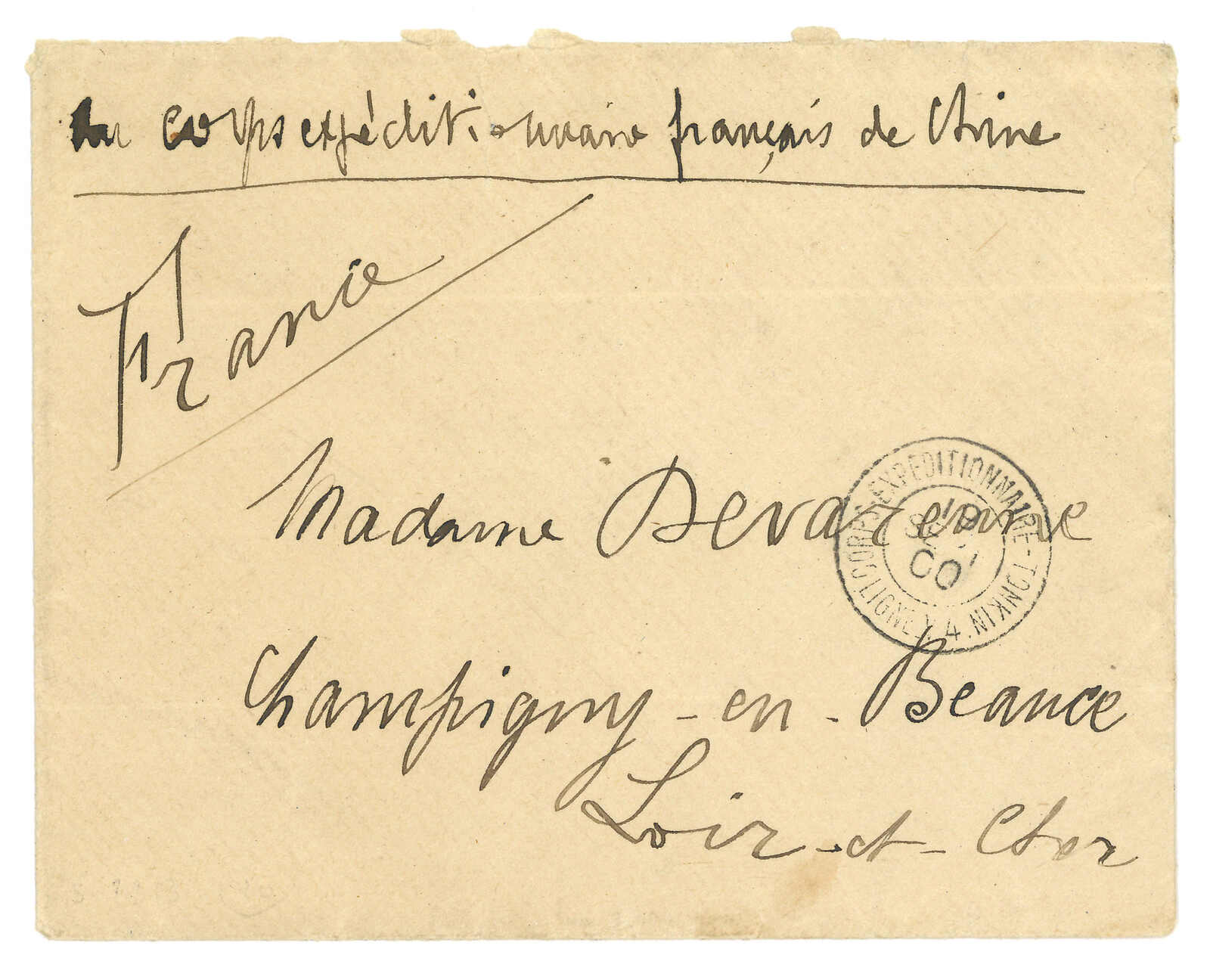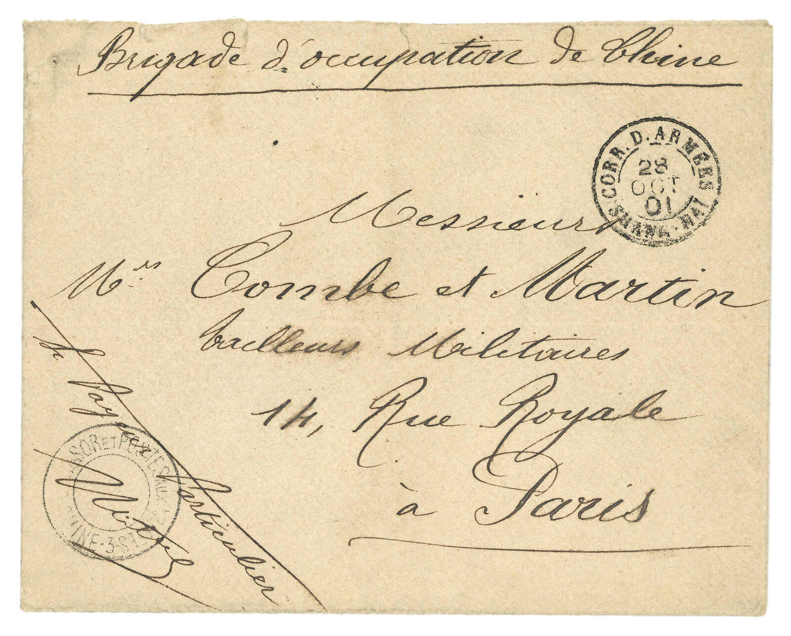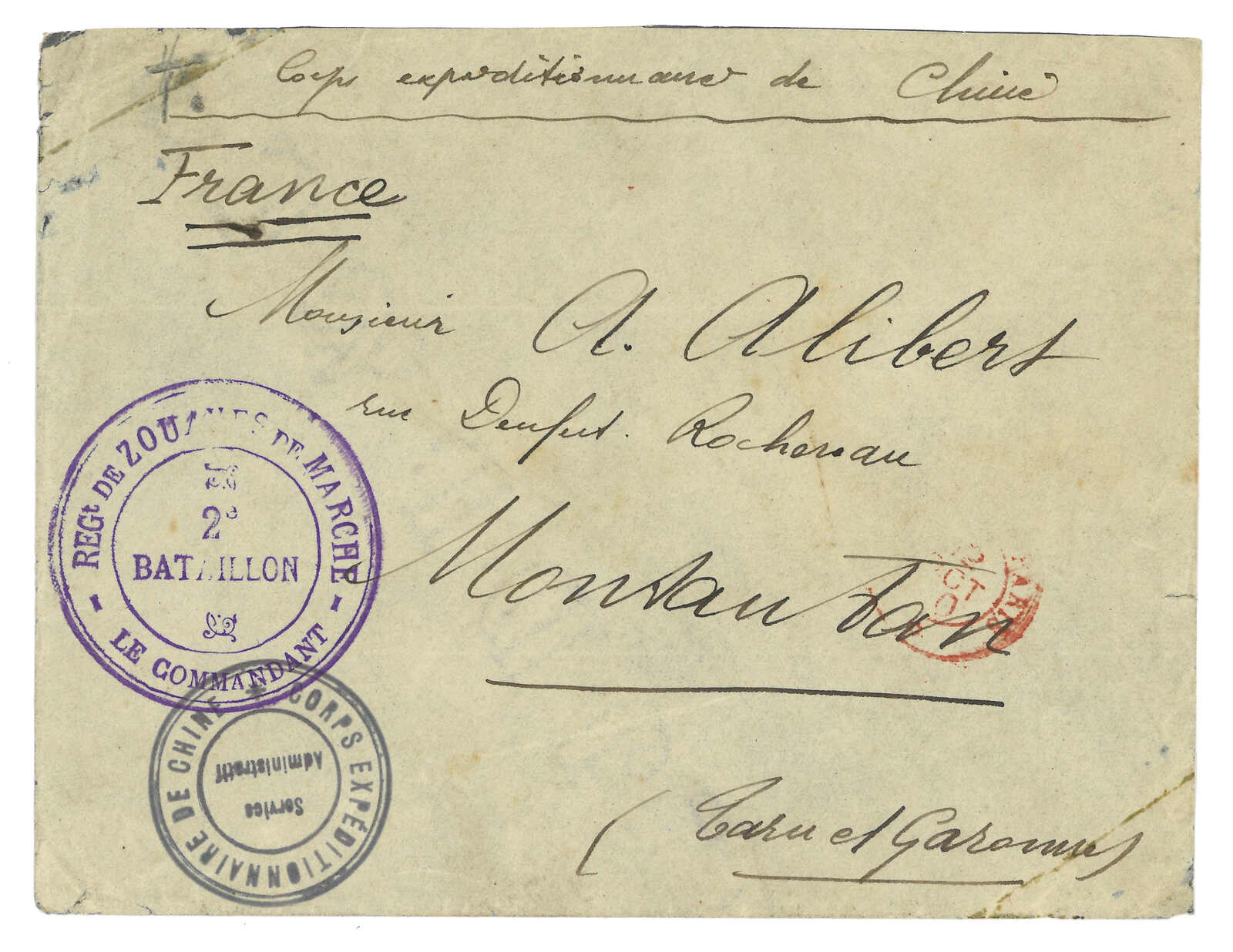 1900 Corps Expeditionnaire de Chine cover to France, applied with “REGT DE ZOUAVES DE MARCHE / 2e VATAILLON / LE COMMANDANT” and “Serivce Administratif” circular h.s. Arrived France (14 Oct).
