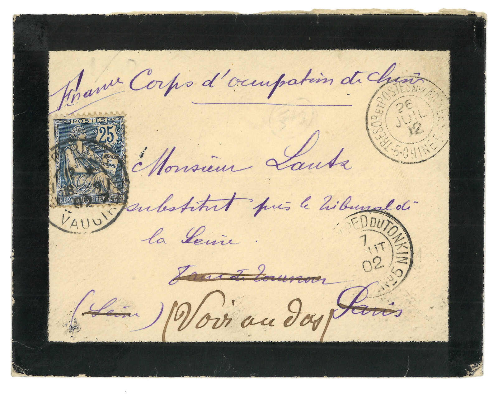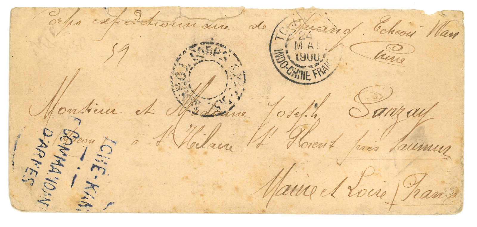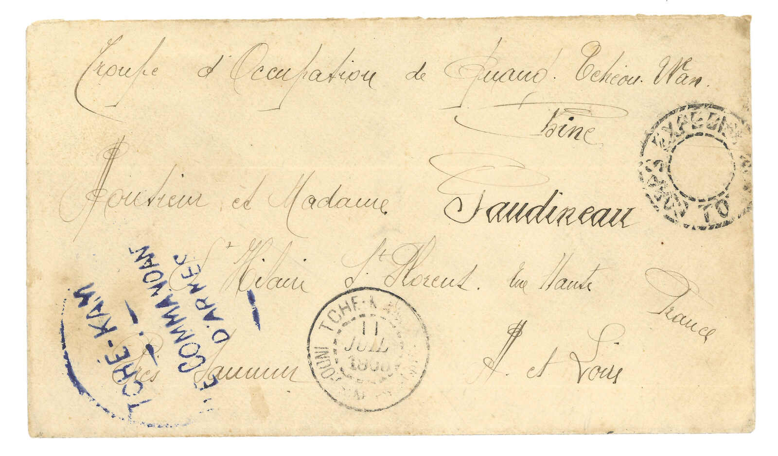 1900 Corps Expeditionnaire de Chine cover to France, applied with “REGT DE ZOUAVES DE MARCHE / 2e VATAILLON / LE COMMANDANT” and “Serivce Administratif” circular h.s. Arrived France (14 Oct).