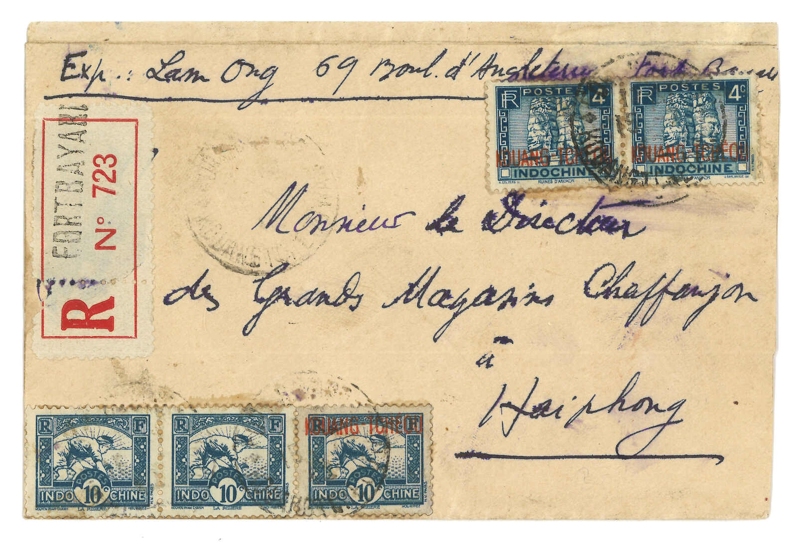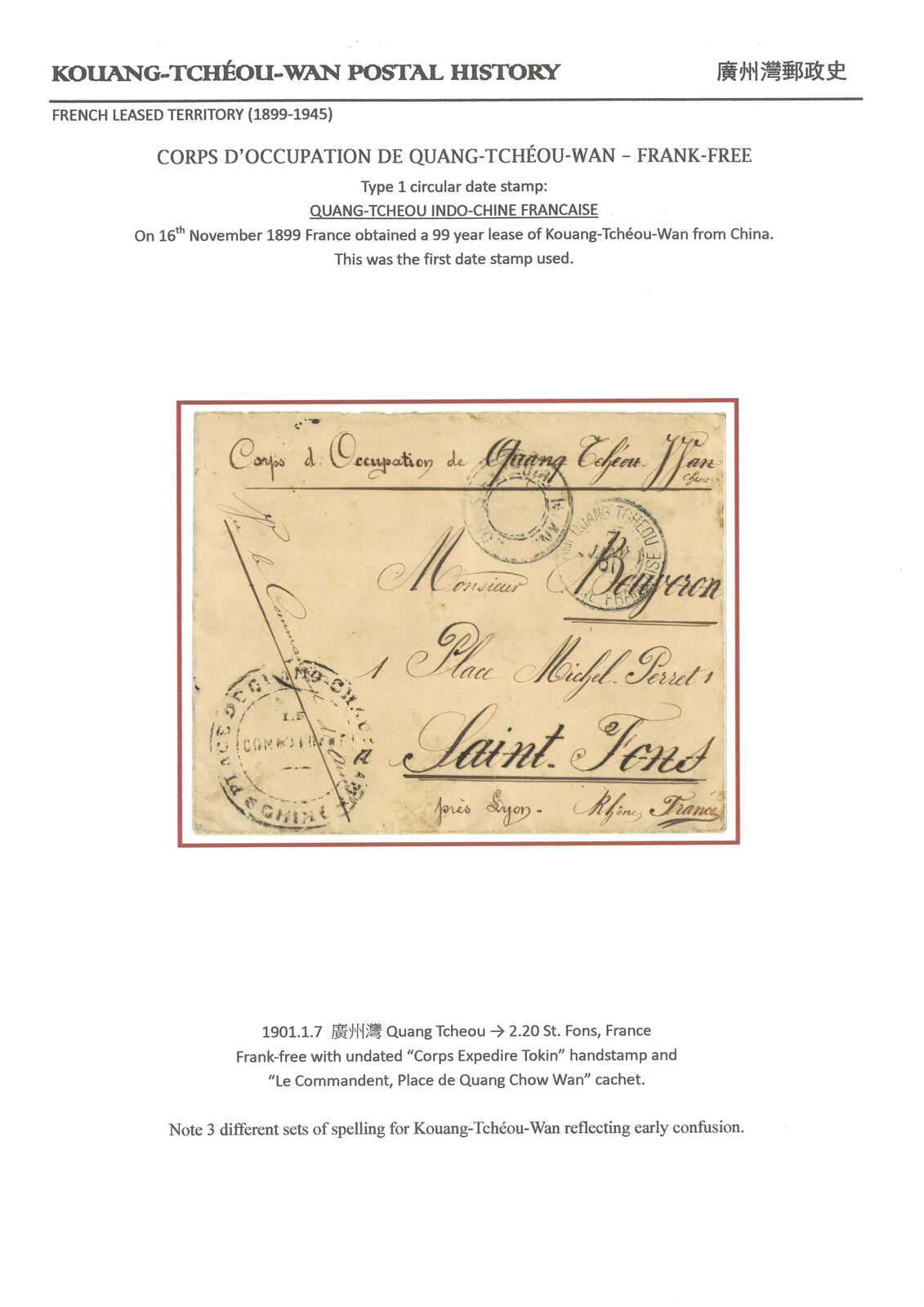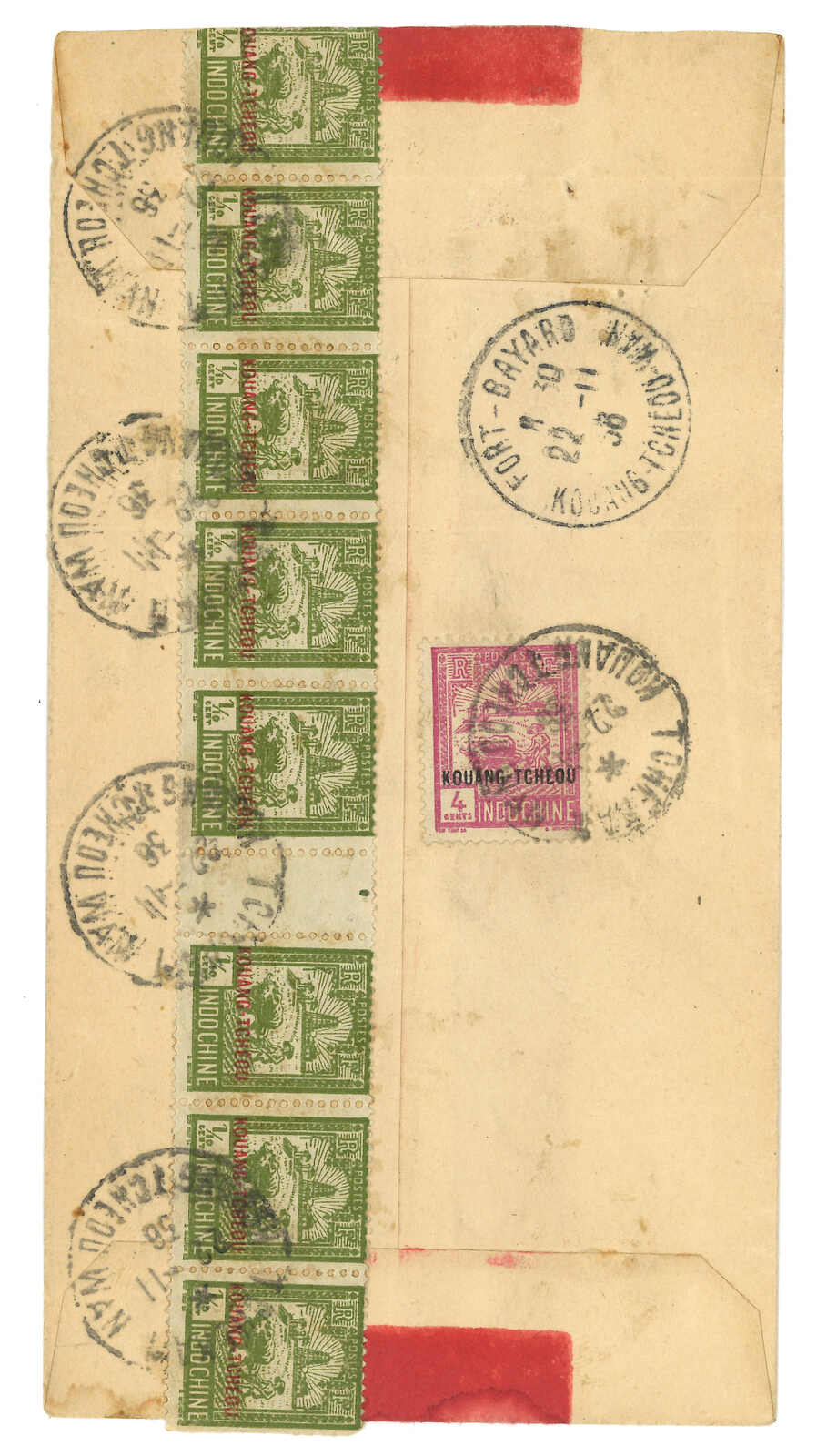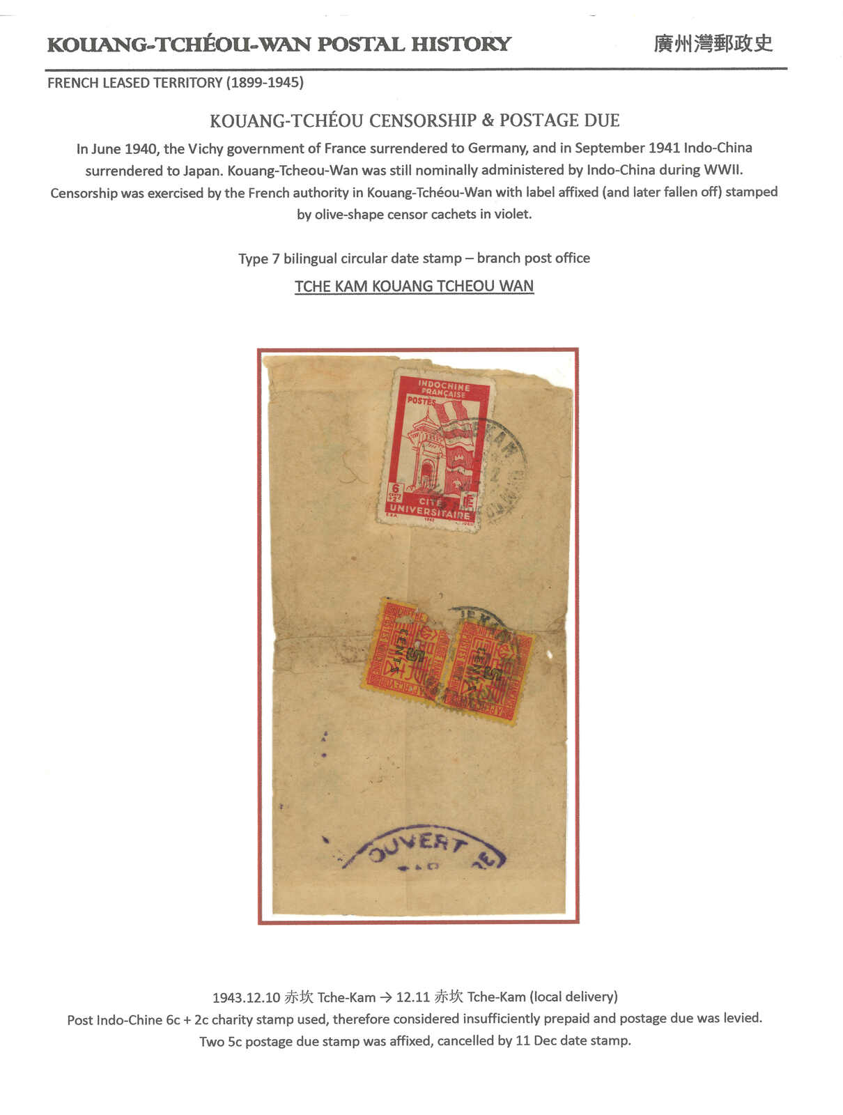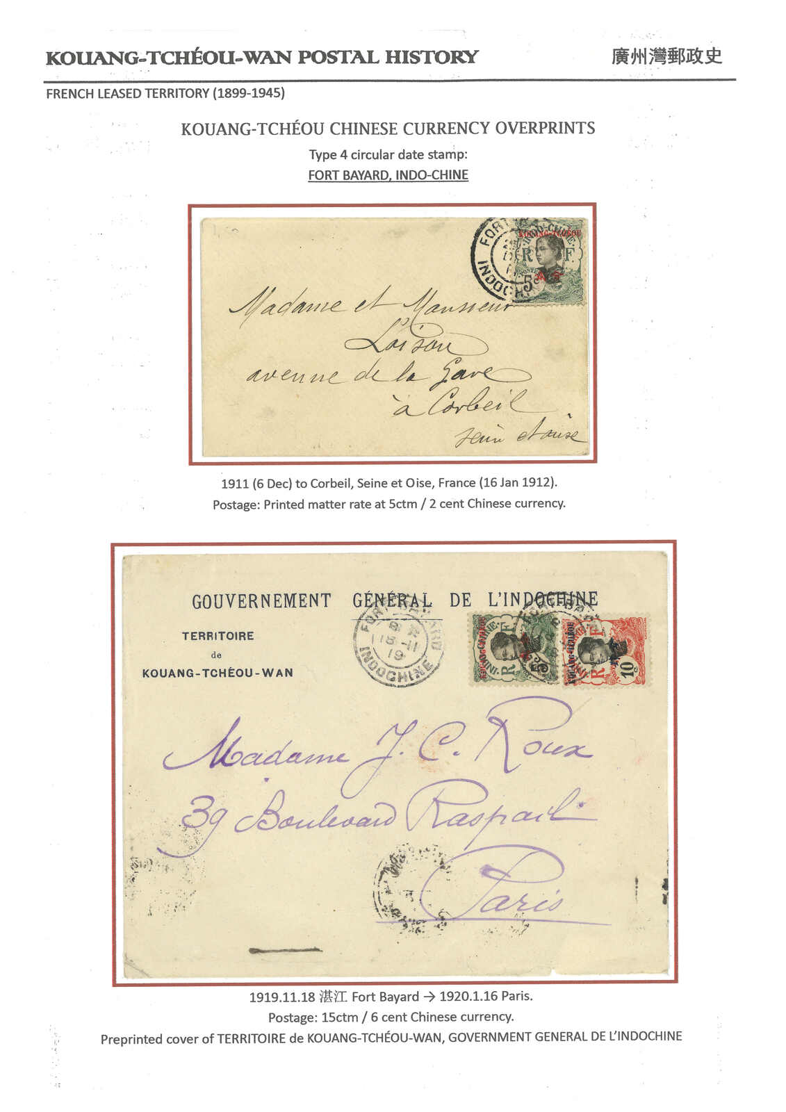 1900-1940s a comprehensive collection of Kouang Tcheou Wan postal history, containing over 50 covers and postcards. Outstanding items including scarce "TCHE-KAM / LECOMMANDANT D'ARMES" circular seal and Potsi cds. Please