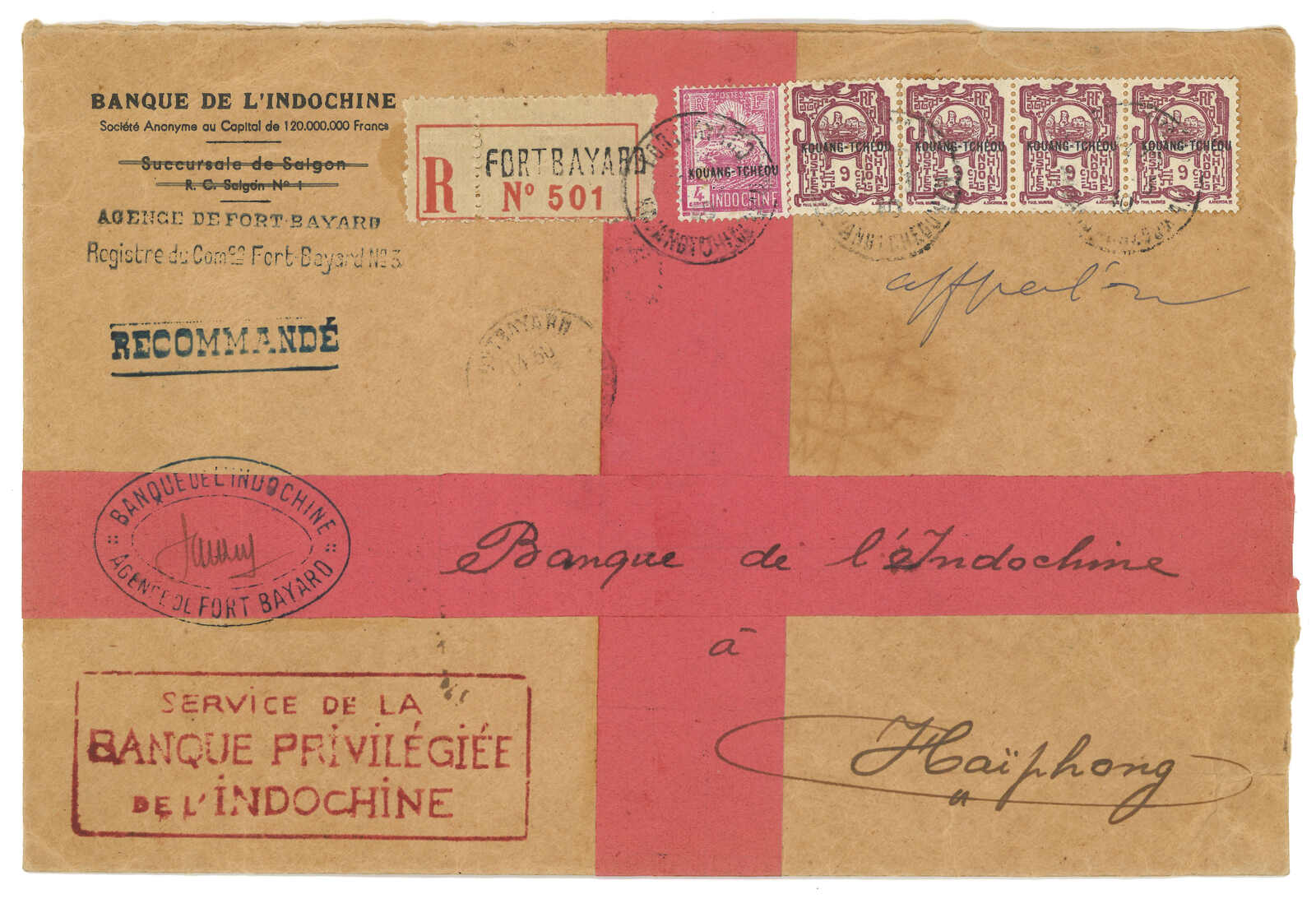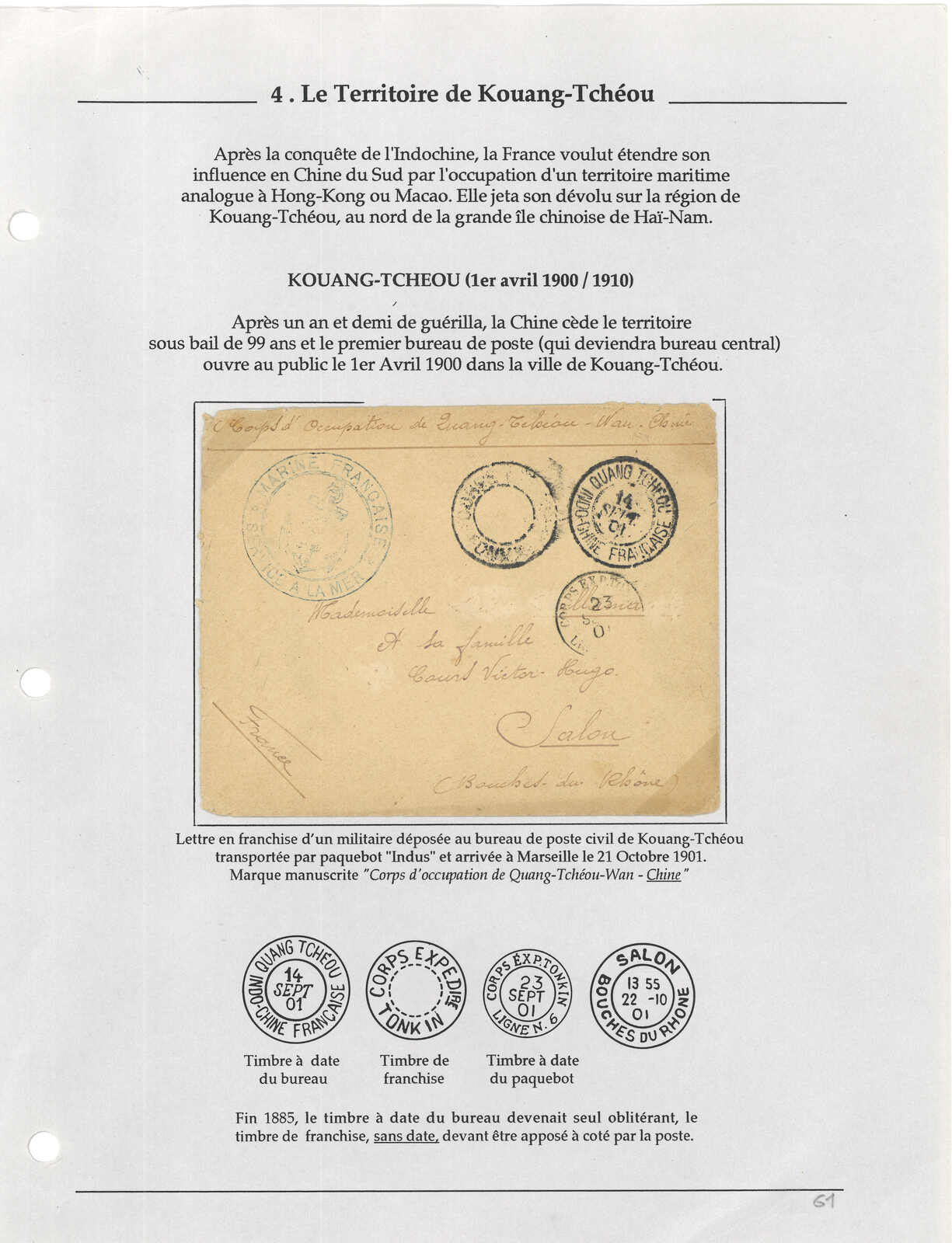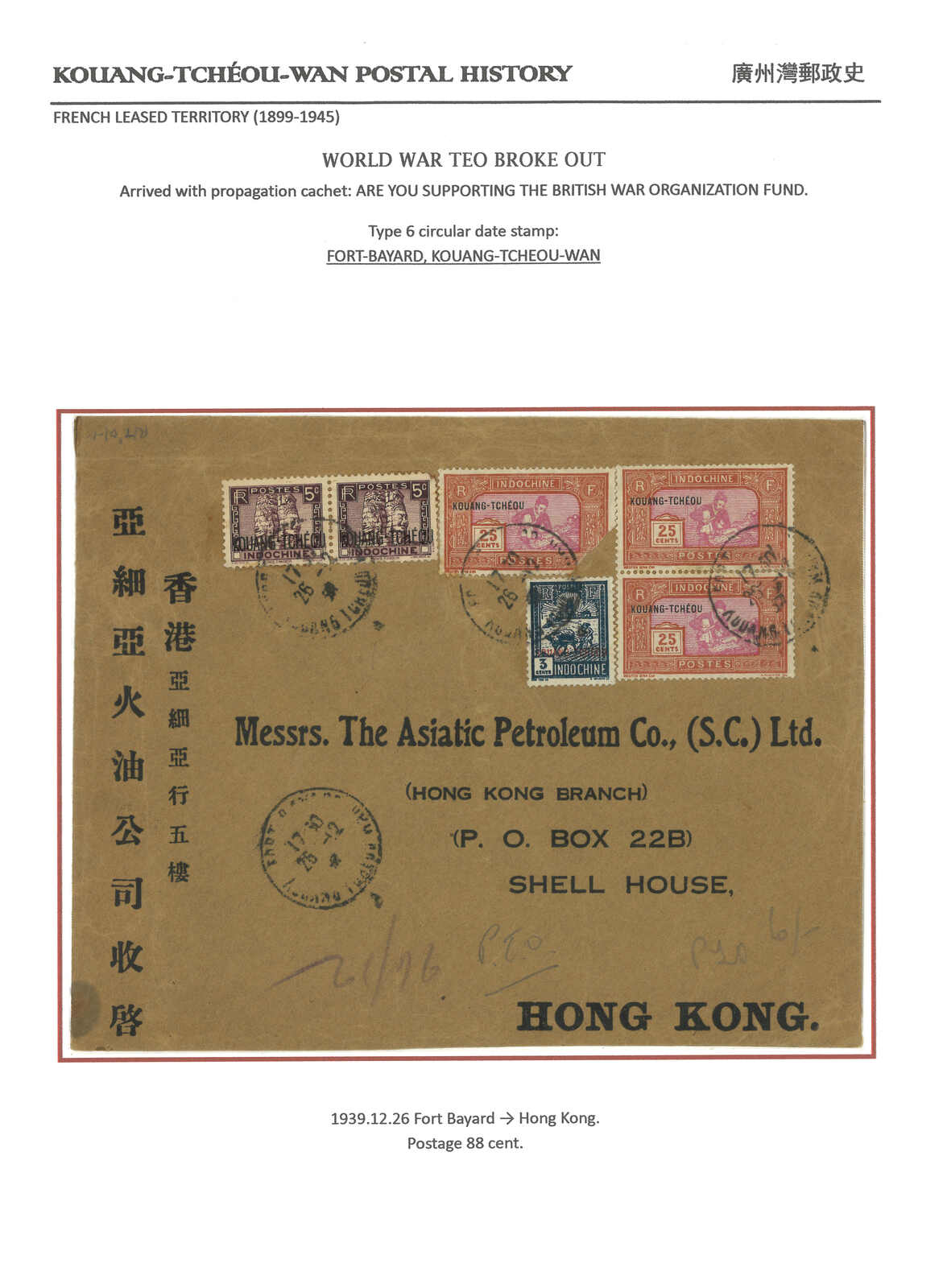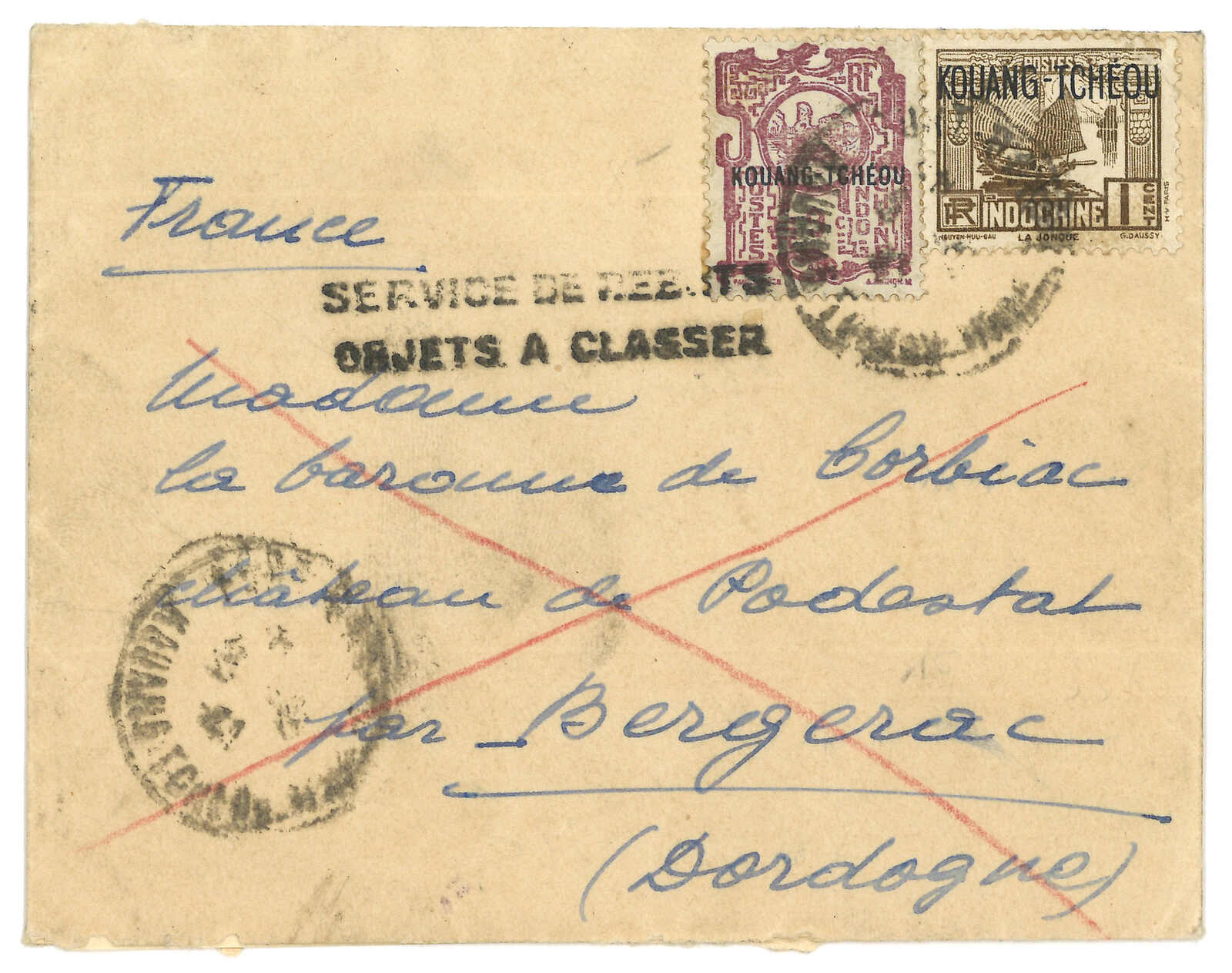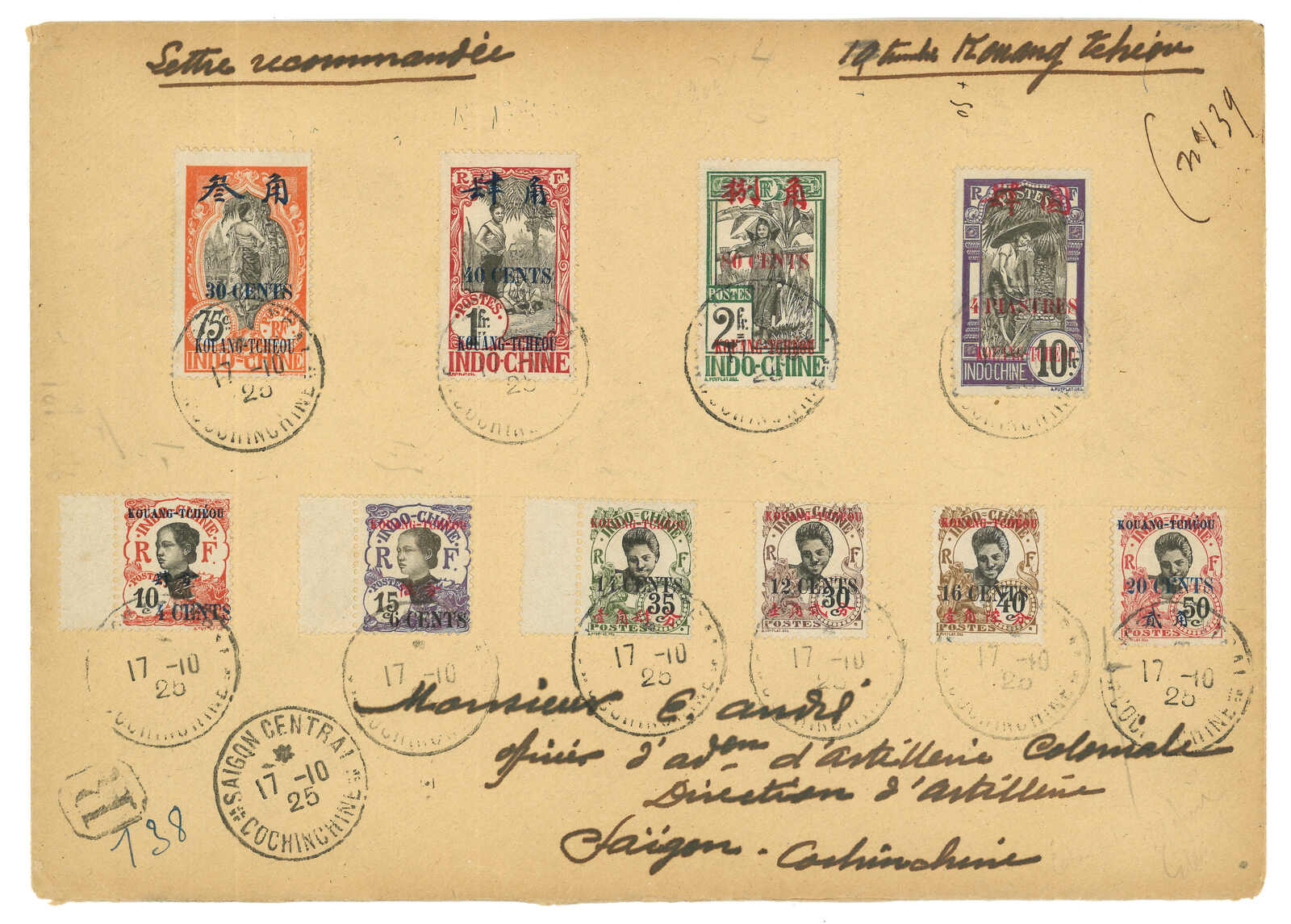 1900-1940s a comprehensive collection of Kouang Tcheou Wan postal history, containing over 50 covers and postcards. Outstanding items including scarce "TCHE-KAM / LECOMMANDANT D'ARMES" circular seal and Potsi cds. Please