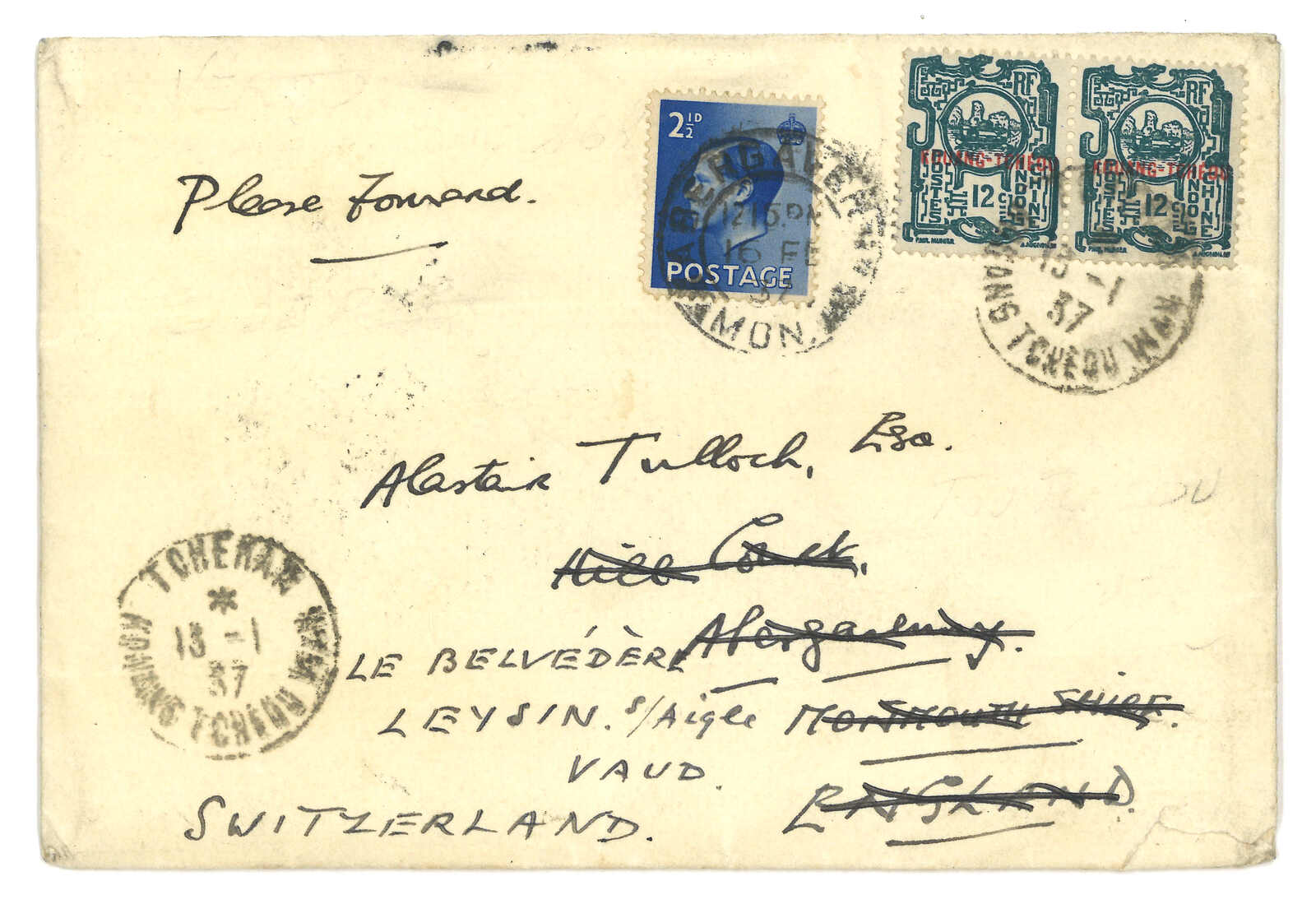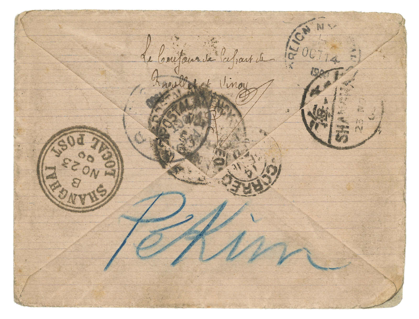 1900 France (20 Aug) to a soldier of Corps Expeditionnaire de Chine onboard Duguay at Shanghai, redirected to Peking, applied with French origin cds. Transit Shanghai Chinese PO and local PO (Nov). Scarce incoming naval