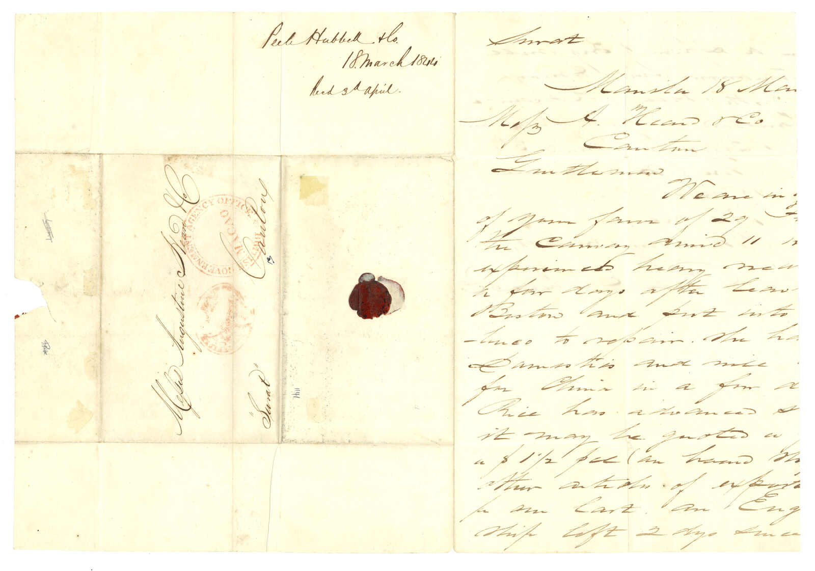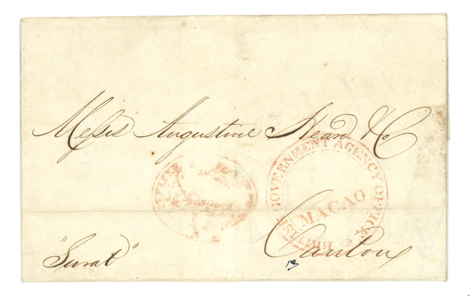 1844 (18 Mar) Manila, Philipiness to Augustine Heard & Co, Canton. Entire, sent “Surat”, along with double-ringed “BRITISH GOVERNMENT AGENCY OFFICE / MACAO” type 1-3-1 seal in red and Hong Kong Post Office Webb type 4