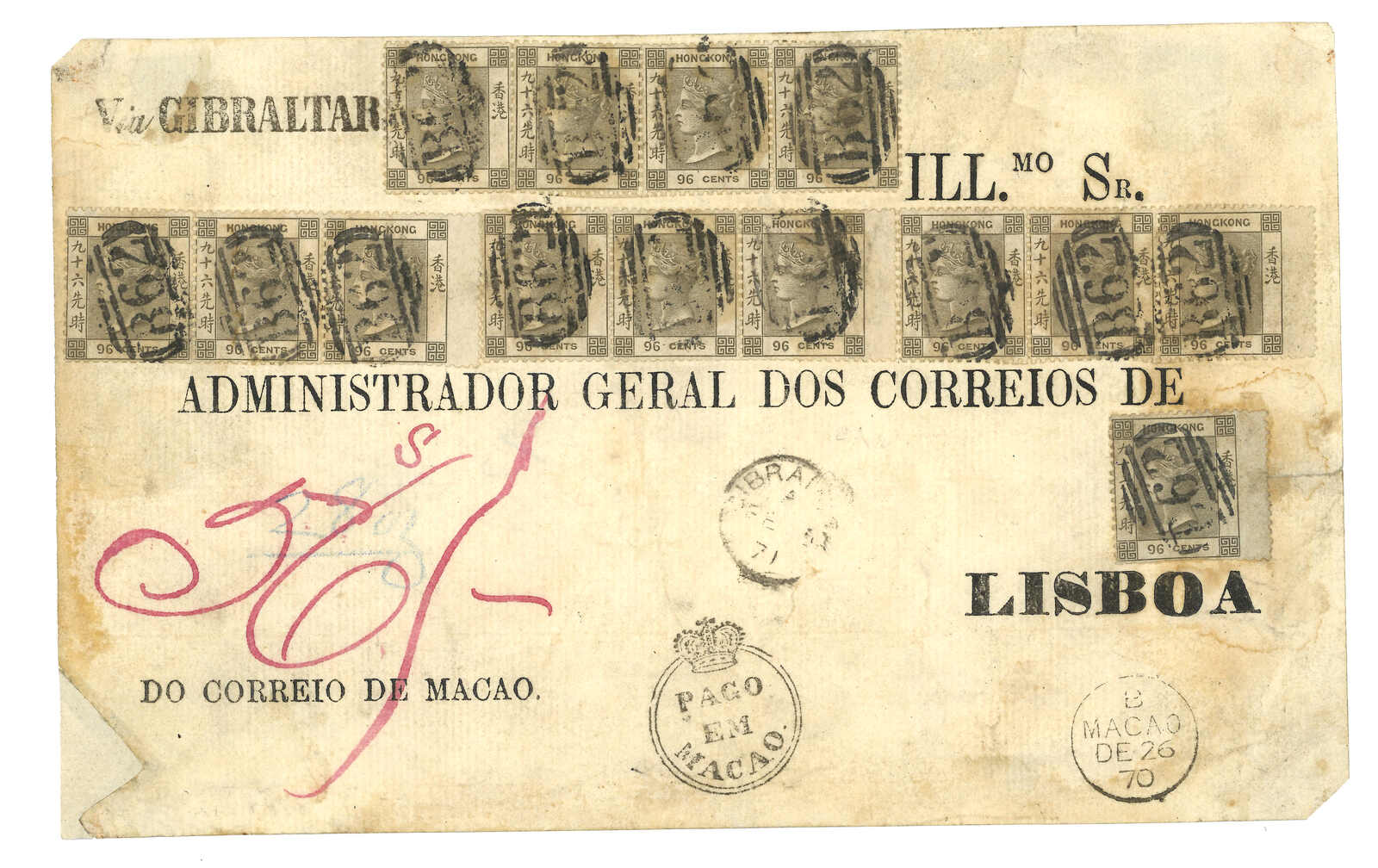 1870.12.26 Packet front, from Macao to the Chief Postmaster in Lisbon, sent “Via GIBRALTAR” and rated “56sh” in red ink, f.w. Hong Kong QV 96c x 14, tied by B62 obliterator. Alongside bearing Crowned “PAGO EM MACAO” type 2-7-1