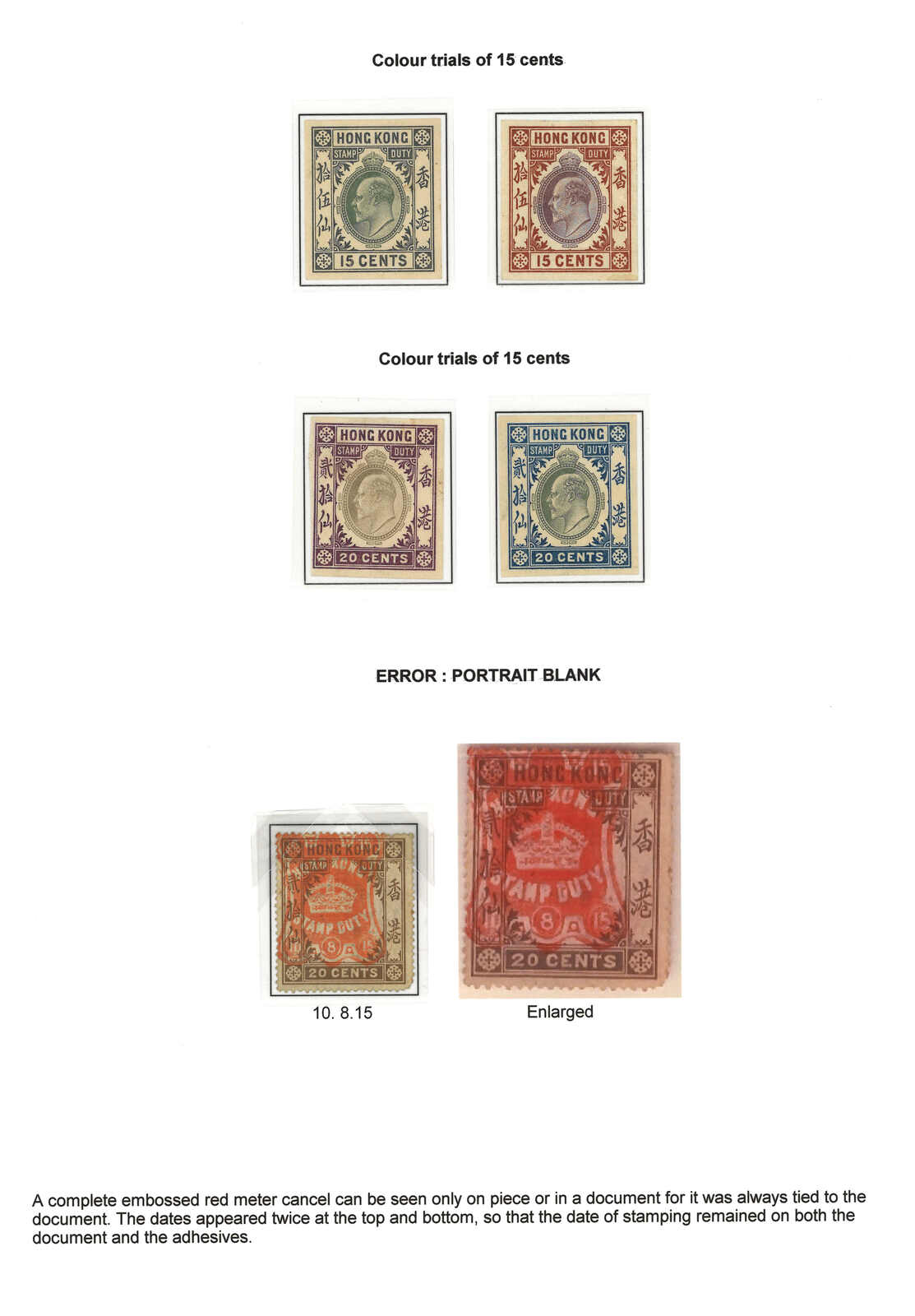 1900年代一組4枚香港愛德華七世像印花稅票試色票,另附1枚漏印頭像錯體票。置於定位頁上。罕。(Image 1)