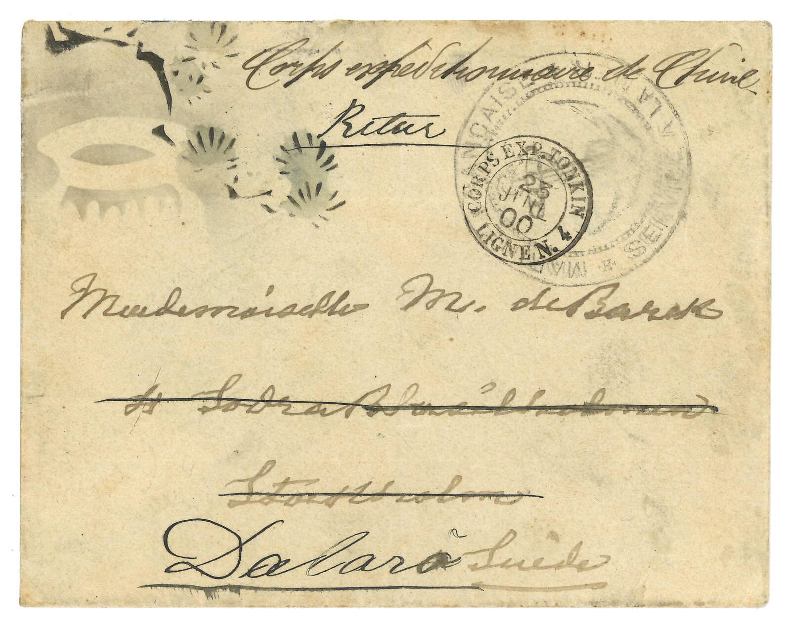 1900 (23 Jul) Corps Expeditionnaire de Chine cover to Sweden, frankless, applied with Corps Exp Tonkin Lig N. 4cds., alongside with French marine circular seal. Transit Stockholm (30 Aug), redirected to Dalaro (31 Aug). Very