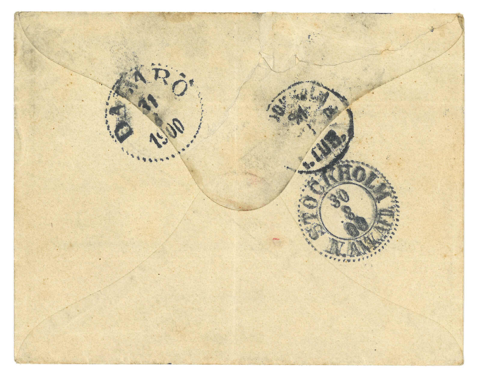 1900.7.23 對華遠征軍封寄瑞典,無貼票,鈐東京遠征軍N線4號日戳,旁鈐海軍陸戰隊圓戳。8.30經斯德哥爾摩,8.31抵Dalaro。甚少見之目的地。1900年6月21日,慈禧向向列強宣戰,此信寄於戰爭爆發初期。(Image 1)