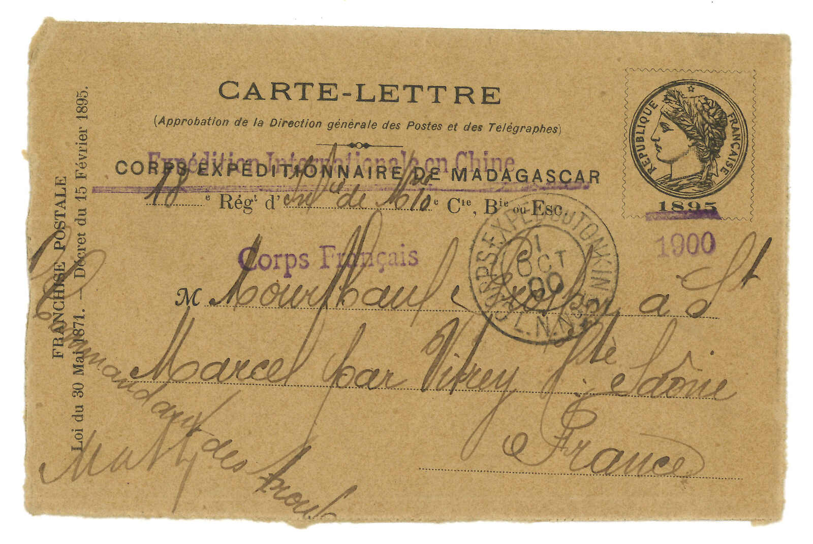 1900 French warship Tiger (31 Aug) to France. “Expedition Internationale en Chine” ovpt. on “Corps Expeditionnaire de Madagascar” lettercard, applied with Corps Exped du Tonkin L.N. No. 5 (1 Oct) cds when Salazie left Saigon,