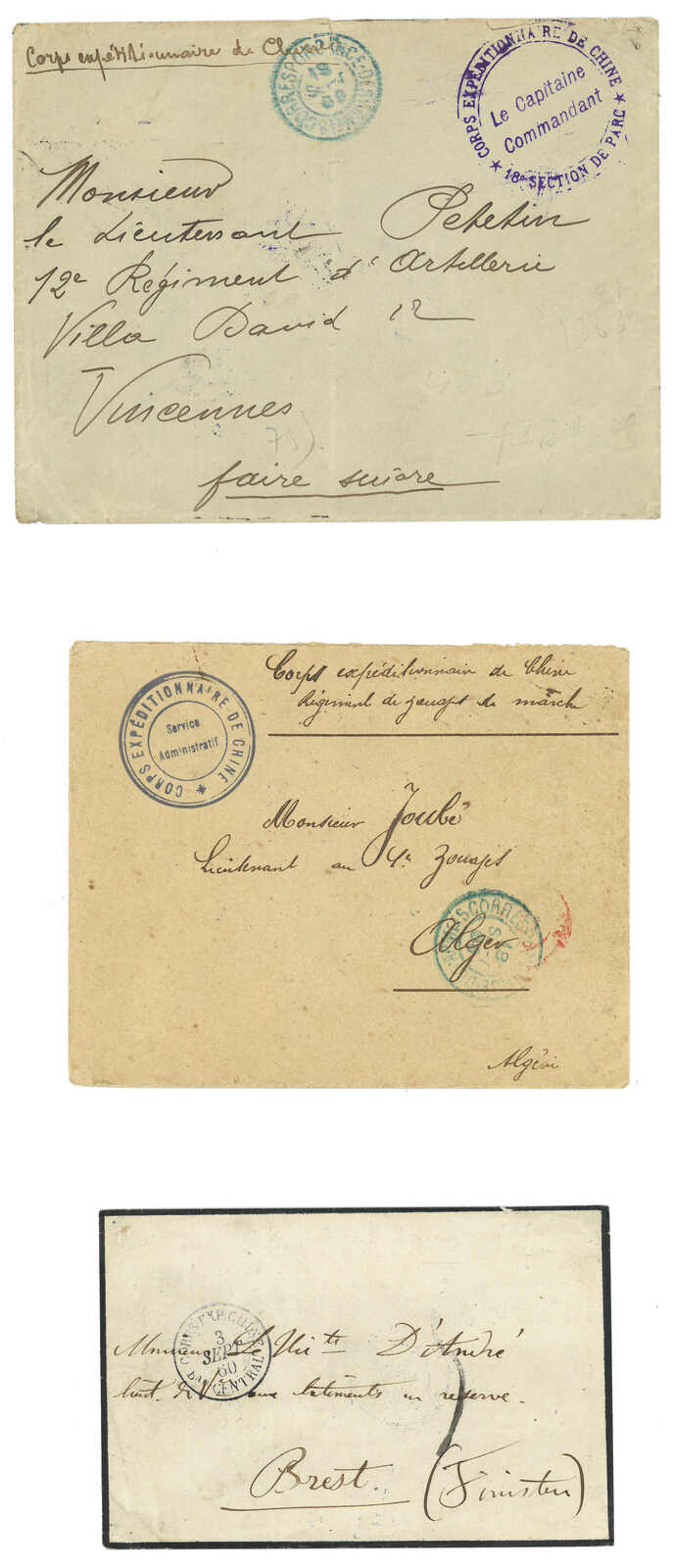1900 a group of 3 Corps Expeditionnaire de Chine covers to France, showcasing “18e Section de Parc”, “Regt de Zouaves de Marche” and other unit seals as well as “Corps Exp Chine / Bau Central” cds. A nice trio gathering
