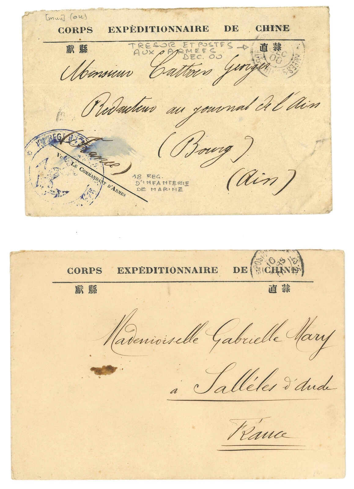 1900 and 1901 a pair of pre-printed “CORPS EXPEDITIONNAIRE DE CHINE” covers to France, both applied with Tresor et Postes aux Armees cds. Former with officer countersign and regiment circular seal in violet. A nice pair for