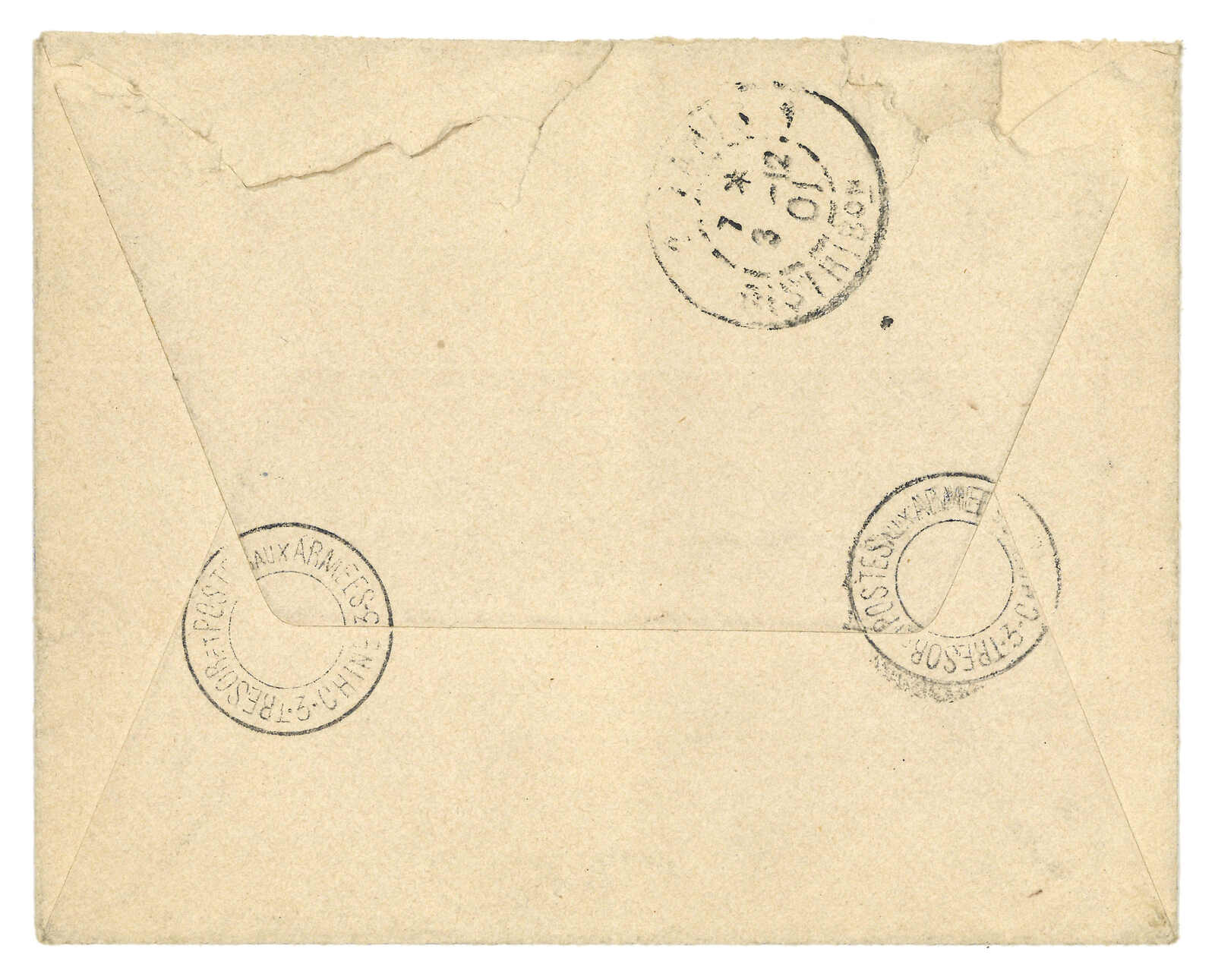 1901年對華遠征軍封寄法國,無貼票,鈐稀罕之法軍3局無日期圓戳,旁帶長官加簽。10.28經上海法軍郵局。12.3抵巴黎。封頂打開。(Image 1)