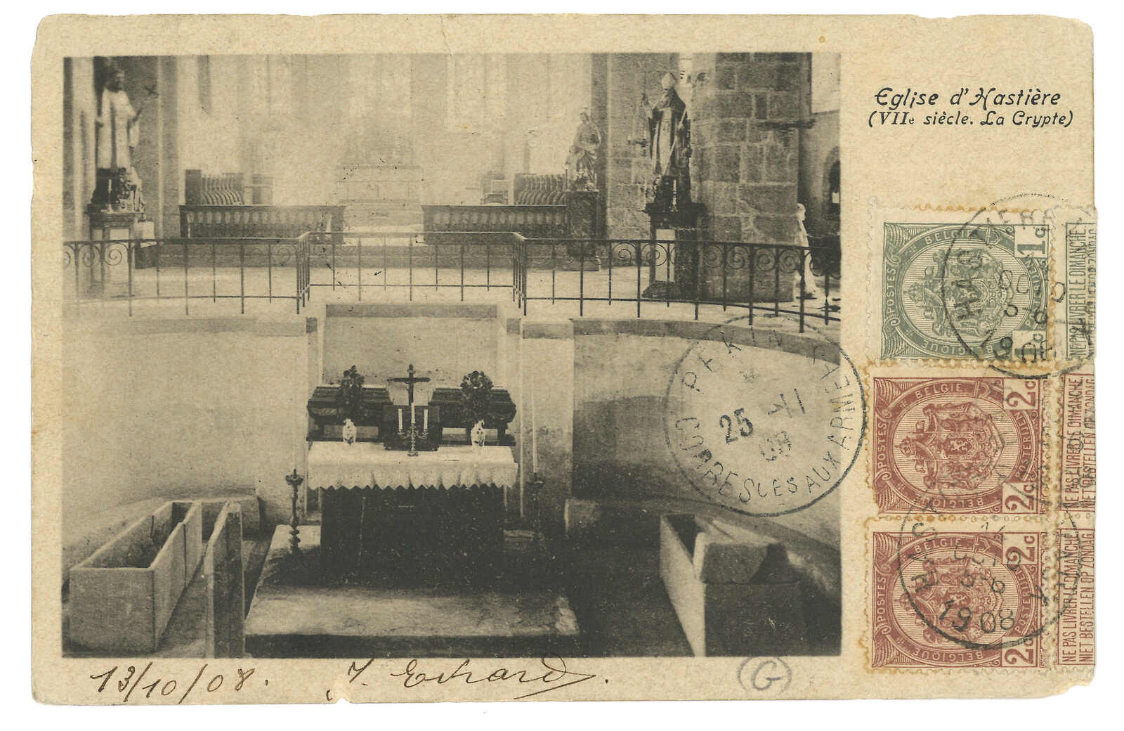 1908 Belgium (10 Oct) to a telegraphist in the 16th Colonials, Peking. Picture postcard, f.w. Belgic Arms 1c + 2c in pair with foot label, tied by Hastiere cds. Transit with Webb No. 7 Hong Kong-To-Shanghai marine sorter (12