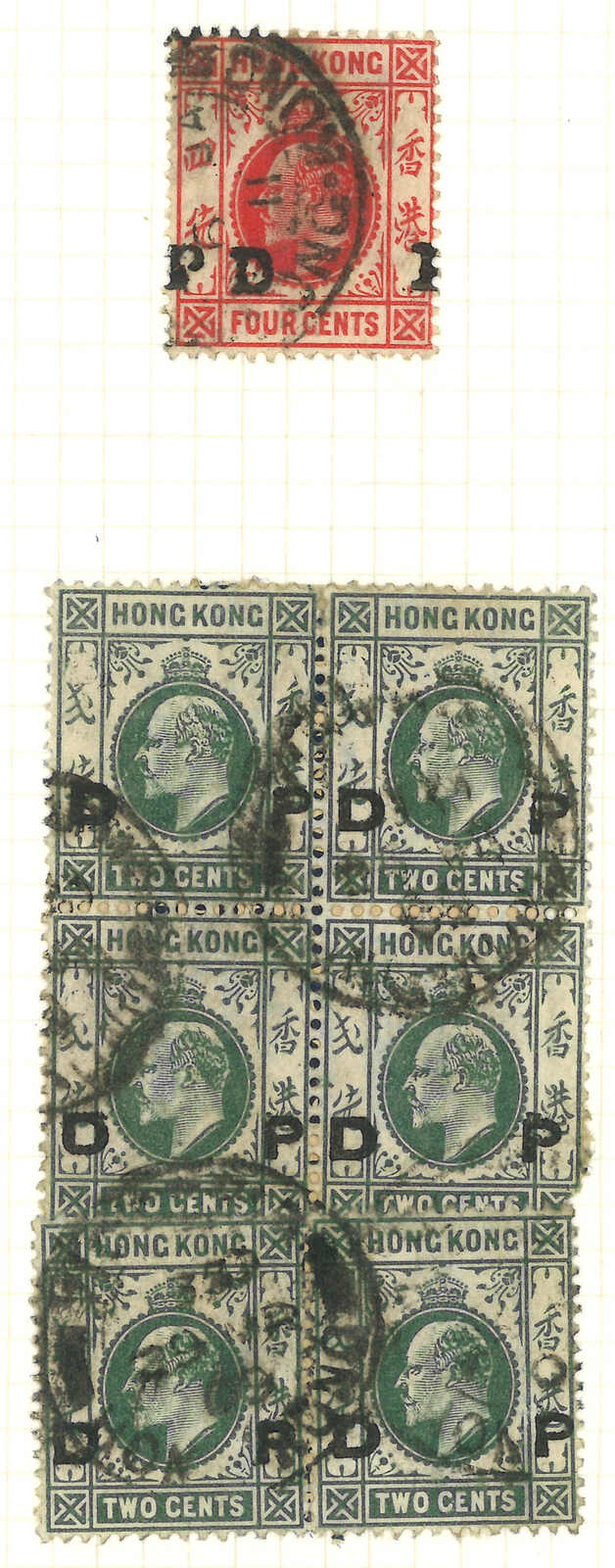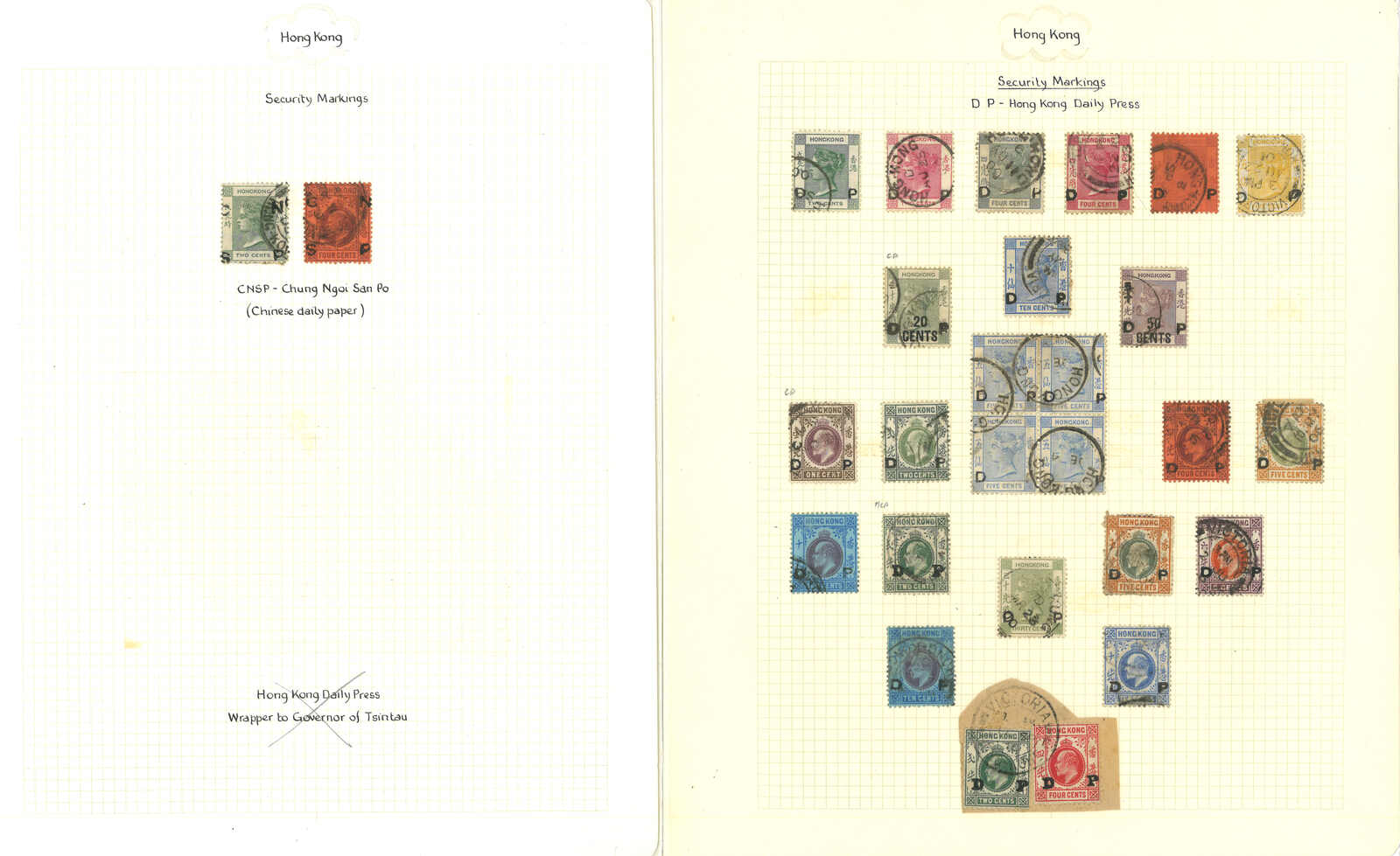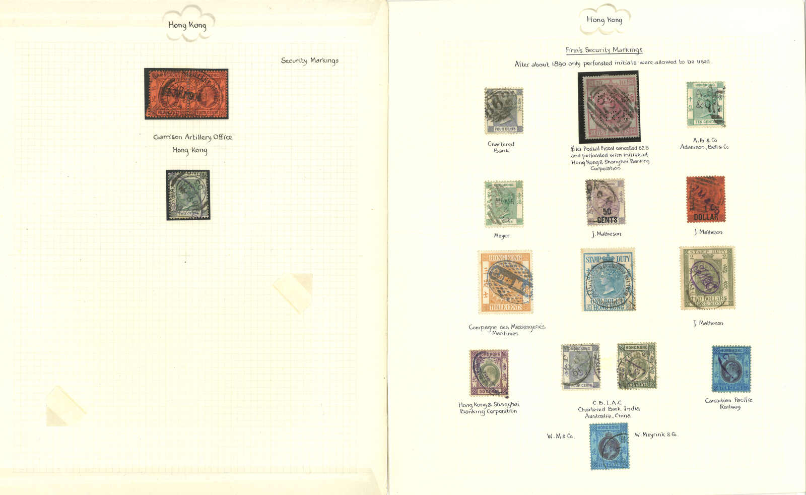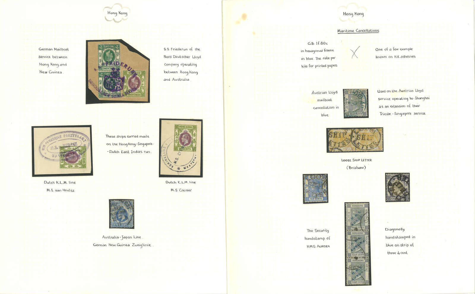 A group of 8 exhibit pages of about 53 Hong Kong QV, KEVII, KGV used stamps and pieces, applied with various maritime cancellations and firm’s security, such as Austrian Lloyd, HMS, German and Dutch Line, Chartered Bank, J.