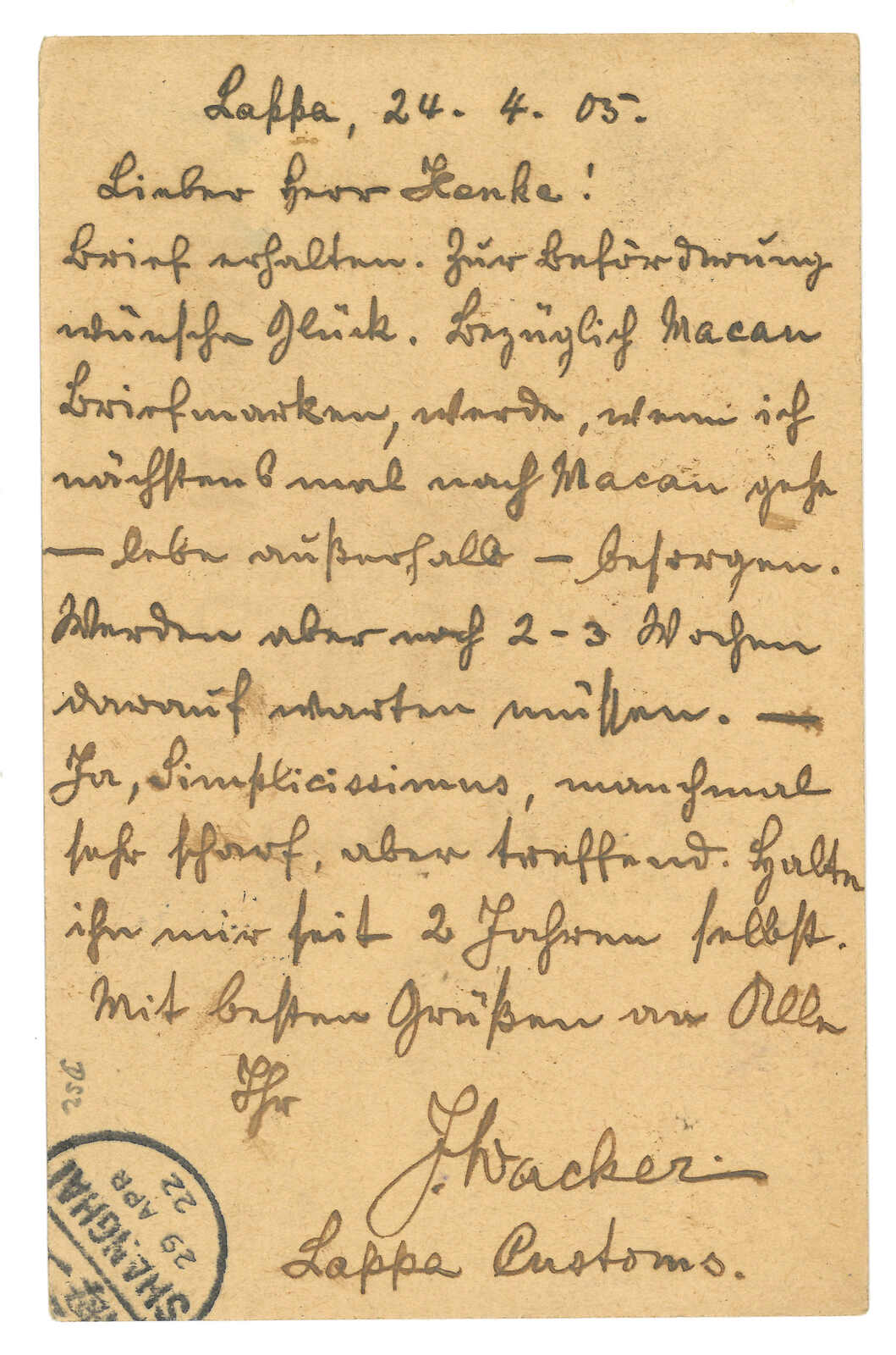 1905 Custosm Lappa (24 Apr) to Tsingtau. Carlos I 4a PSC (Yang P36), applied with Customs Lappa cds while indicia tied by Macao cds. Transit Hong Kong (25 Apr). Arrived Tsingtau Germna PO (4 May).