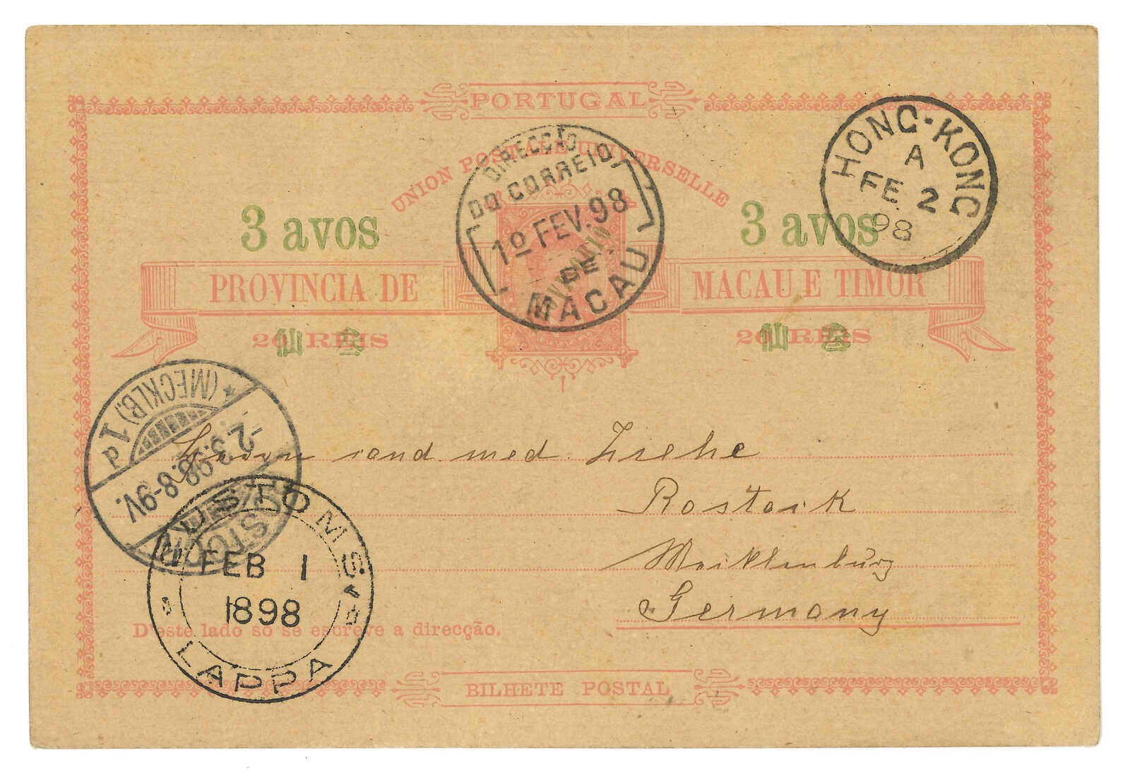 1898 Customs Lappa (1 Feb) to Germany. Luis I surch 3a/30r PSC (Yang P9), applied with Customs Lappa cds while indicia tied by Macau cds. Transit Hong Kong (2 Feb). Arrived Germany (2 Mar). Outgoing examples from Customs Lappa
