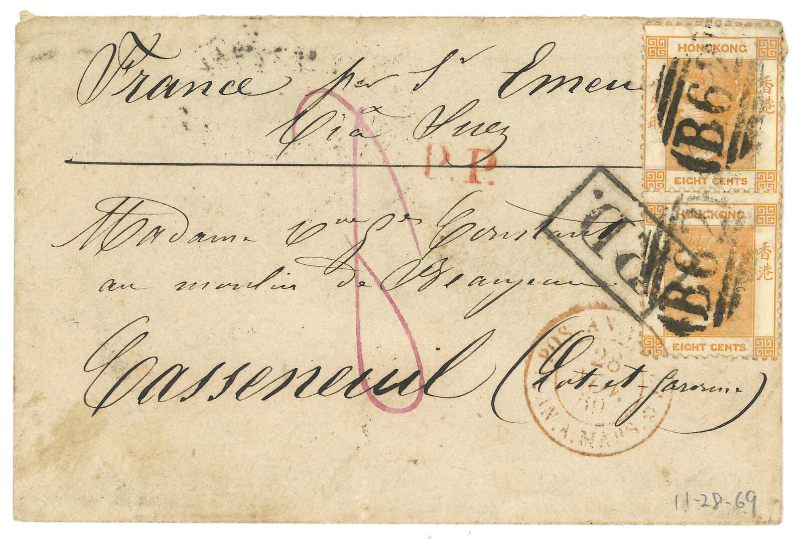 1869年香港寄法國,貼香港維多利亞女皇像8仙x2,銷B62殺手戳。正見“via Suez”批注、PP章及帶框PD章。11.28經馬賽,11.29經圖盧茲。11.30抵Chasseneuil。(Image 1)