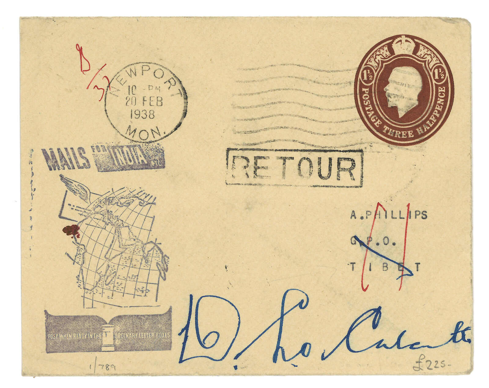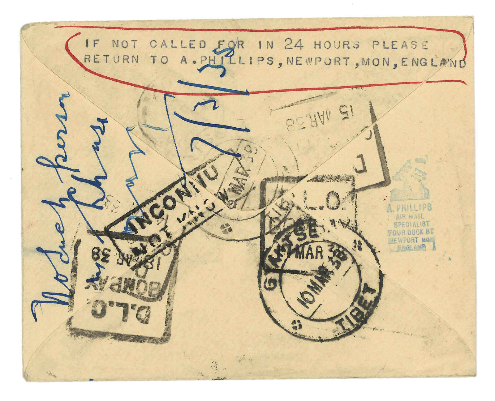 1938 England (20 Feb) to Tibet, returned to sender. British QV 3-1/2p statoinery cover, tied by Newport meter stamp.Arrived Gyantse (6 Mar) with type B5 cds. Showing boxed “INCONNU / NOT KNOWN” and “RETOUR” cachet. Transit