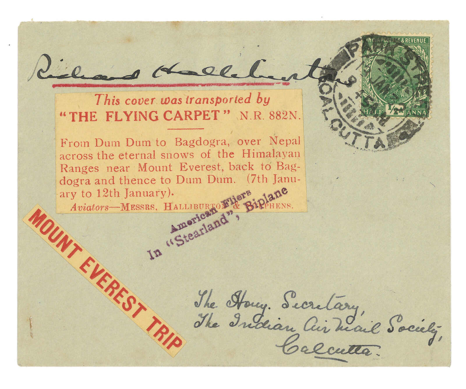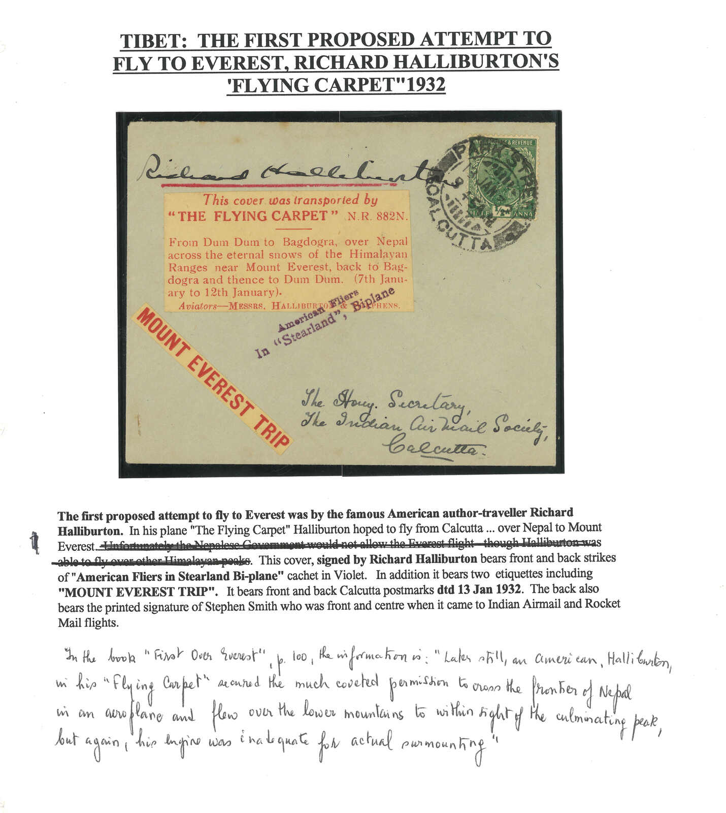 1932 “Flying Carpet” cover from Calcutta to Mount Everest, f.w. Indian KGV 1/2a, tied by Park Street cds. Showing signature of the pilot Richard Halliburton, key figure of Indian airmail Stephen Smith and “American Fliers in