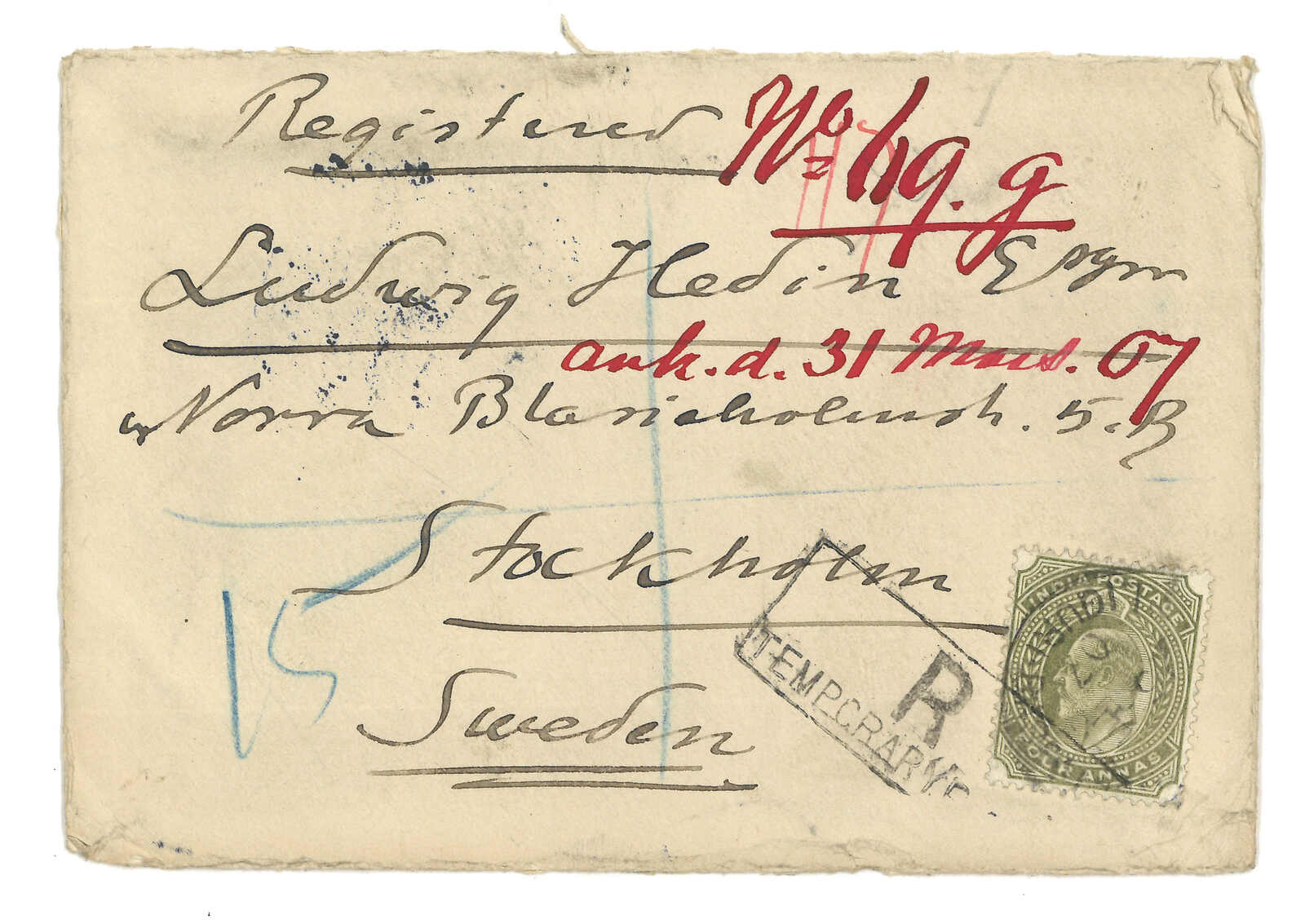 1907 (5 May) Registered cover by Sven Hedin, Gyantse, to Sweden, f.w. Indian KEVII 4a, tied by Gyantse BPO cds., alongside with scarce Gyantse "TEMPORARY PO Y" type G h.s. Arrived Stockholm (31 Mar).