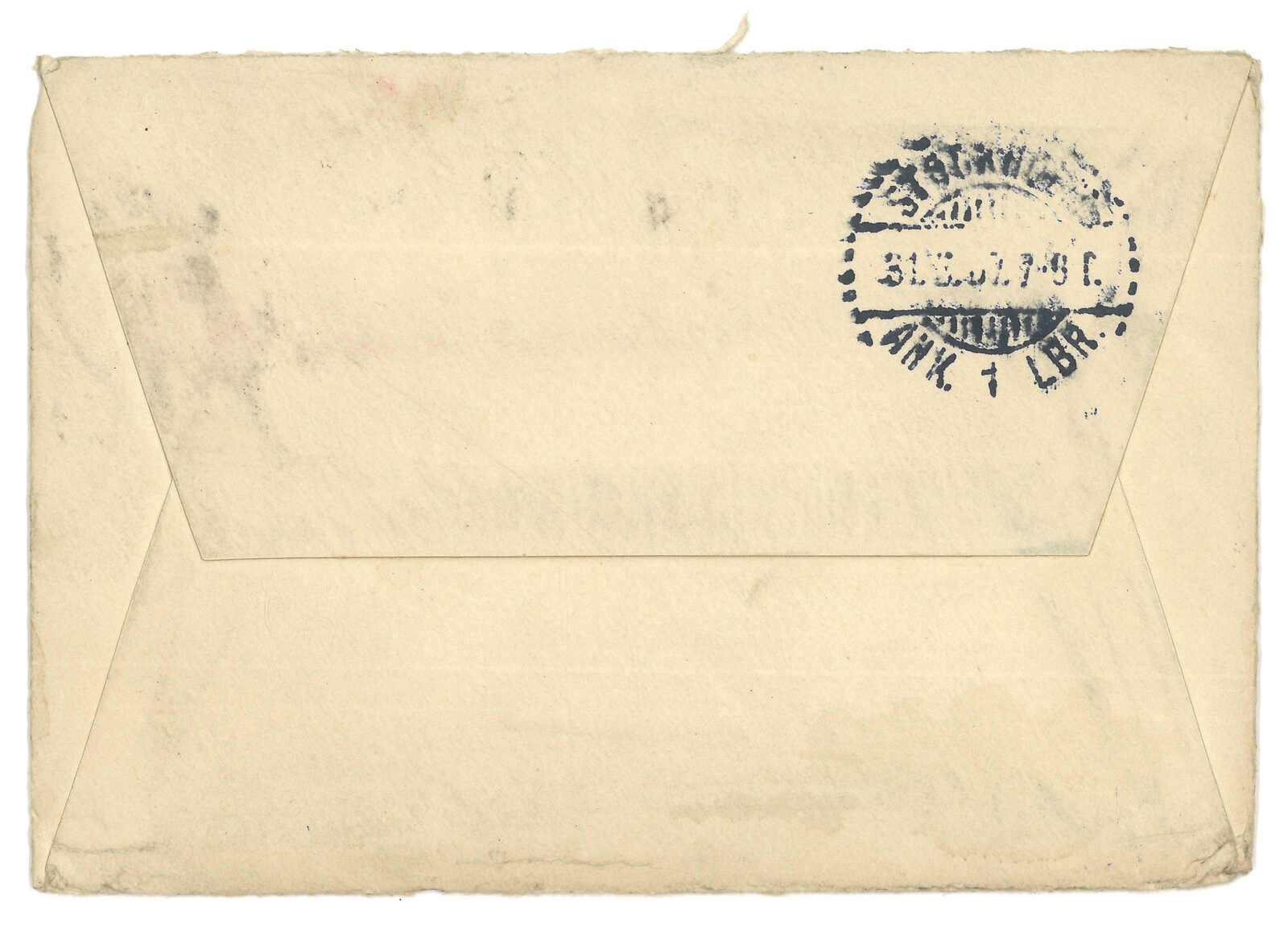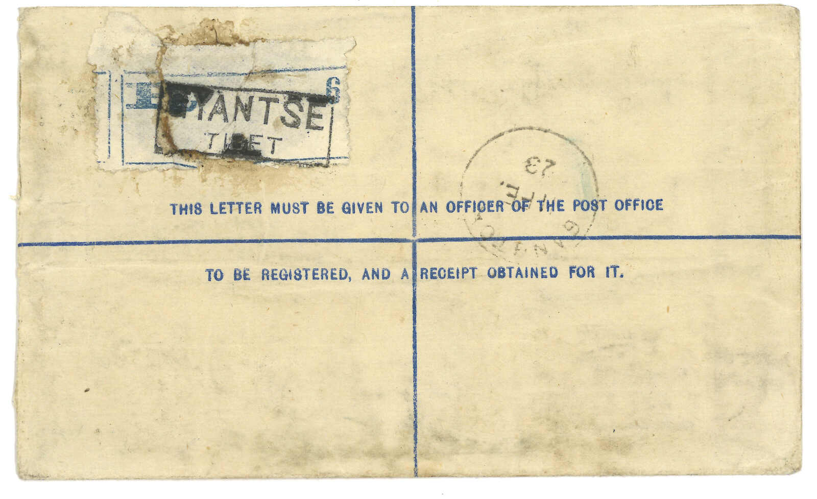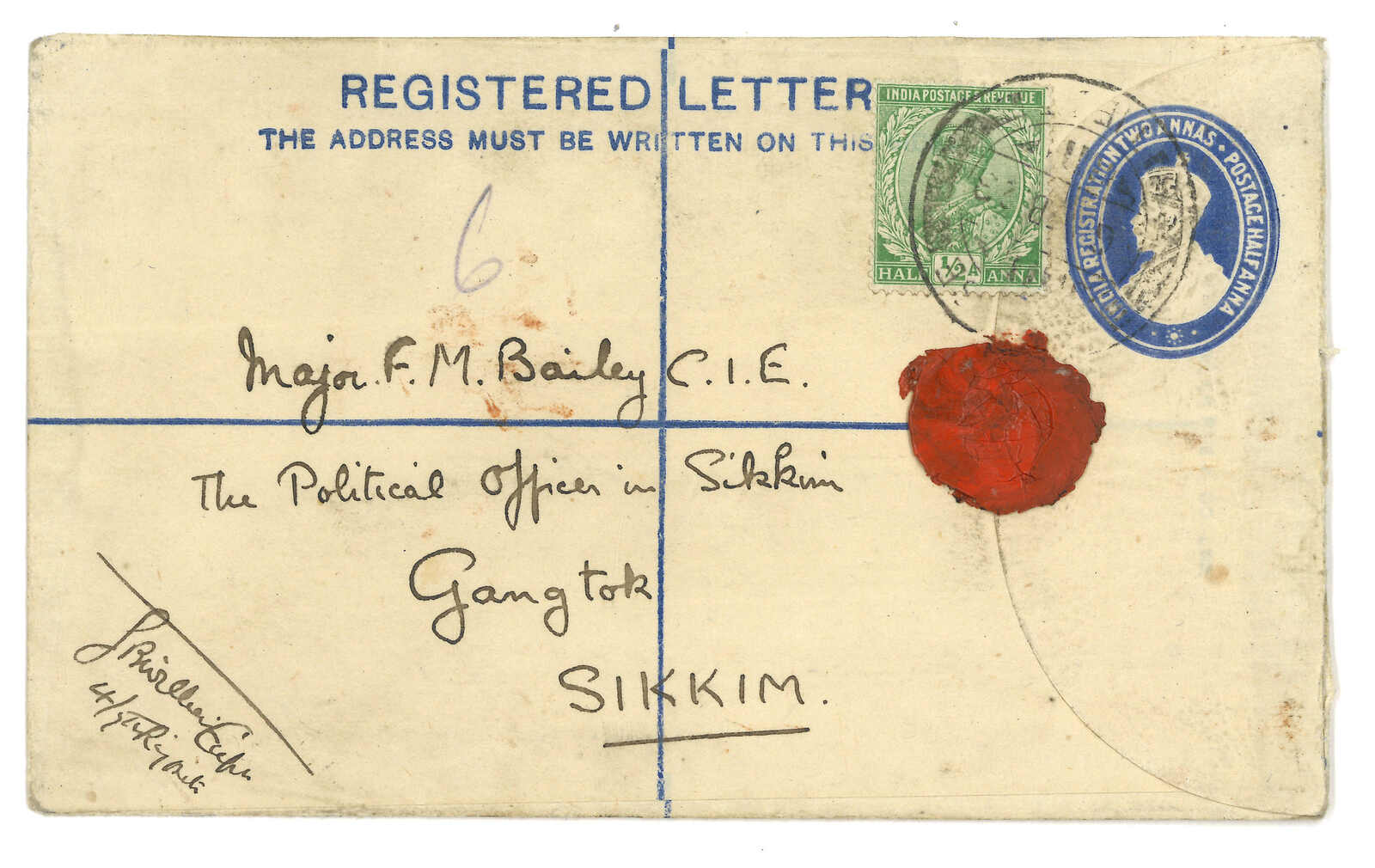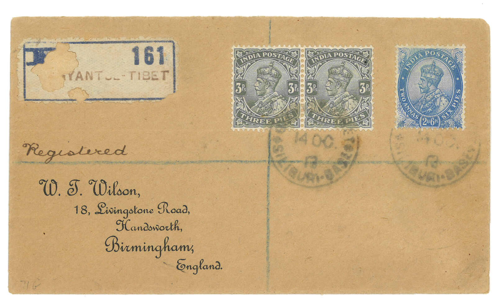 1923年江孜寄甘托克之貝利。印度佐治五世半安那郵資封,加貼半安娜,銷江孜英局日戳。背貼掛號標籤,鈐江孜日戳。貝利於1921年6月至1928年10間為駐錫金政務官。(Image 1)