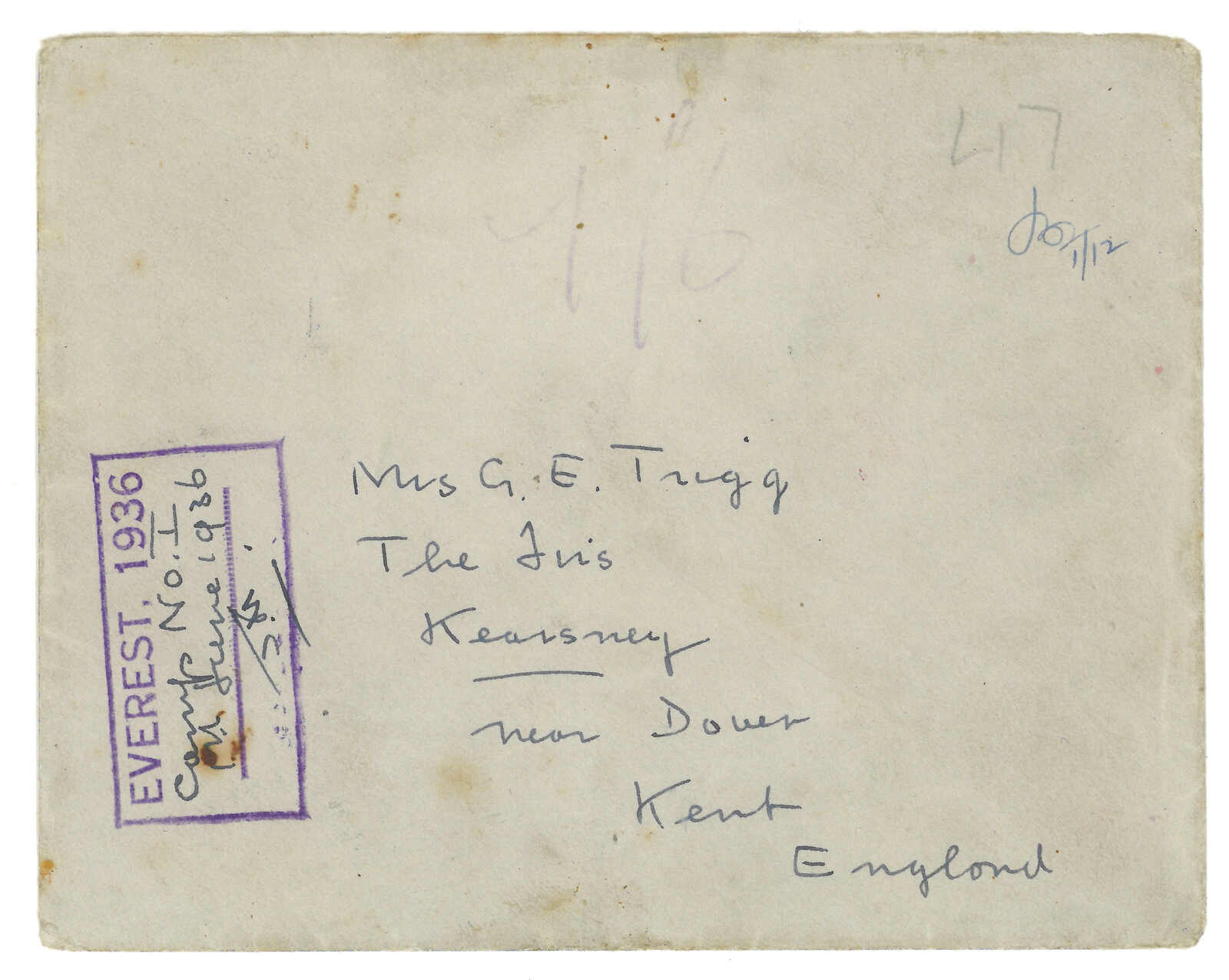 1936年登山探險隊封經甘托克寄英國。正面蓋有額峰G型戳記。背面鈐錫金橢圓戳記及貼有一張闡述郵件遲遞之原因。1936年7月6日,登山隊回到甘托克,發現4月以來的郵件無一寄達。支局局長的房子中發現了未寄出的郵件。他隨後因偷取郵件被捕並入獄,在1937年上訴後獲釋。1000件未寄郵件中有494件被追回。(Image 1)