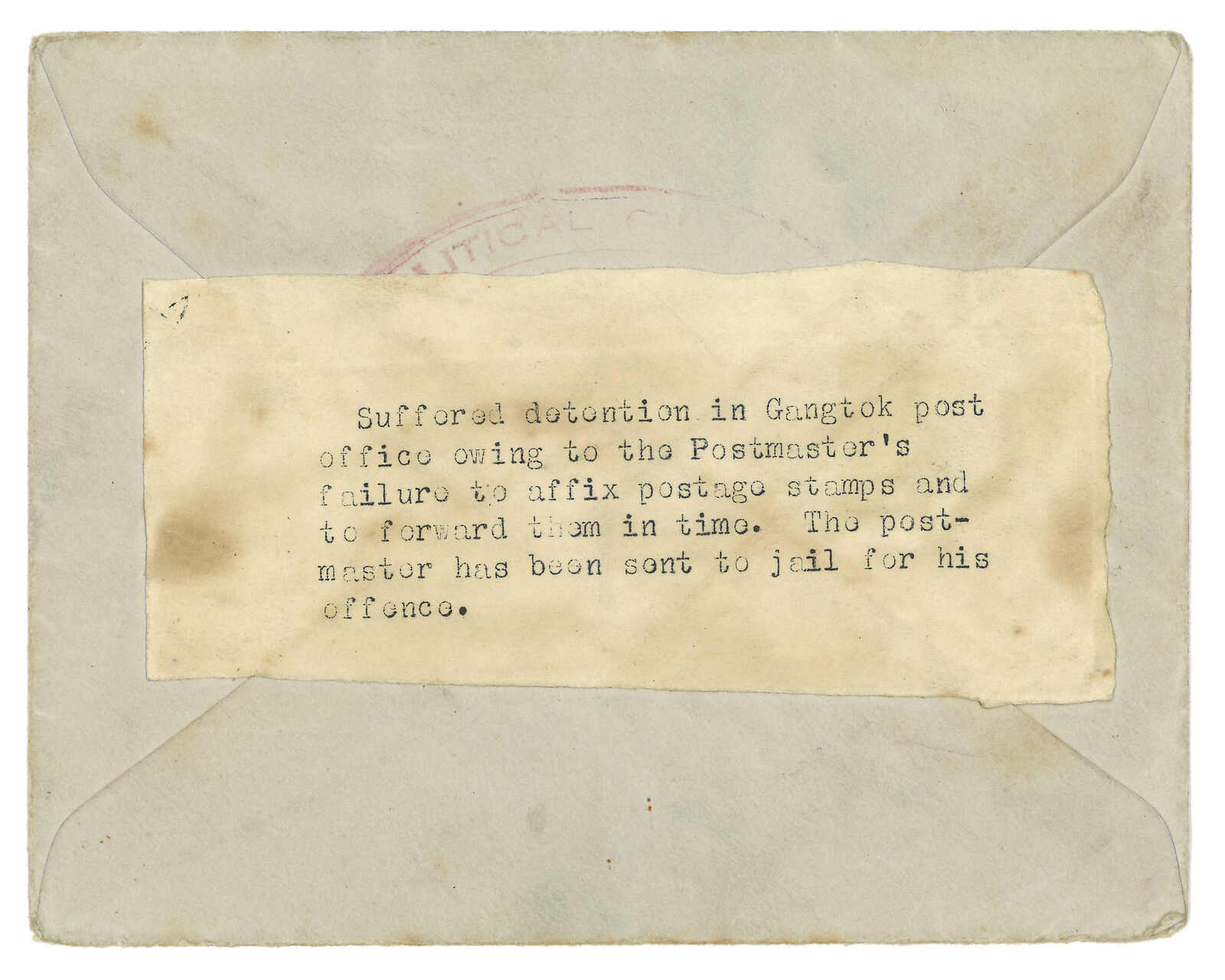 G戳記。貼有字條解釋郵件因甘托克郵局局長而無法送遞。他本人已被捕。1936年7月,登山隊成員發現寄出的信件無法寄達,並在支局長的辦公室內尋回信件。他因此被判入獄。有趣。(Image 1)