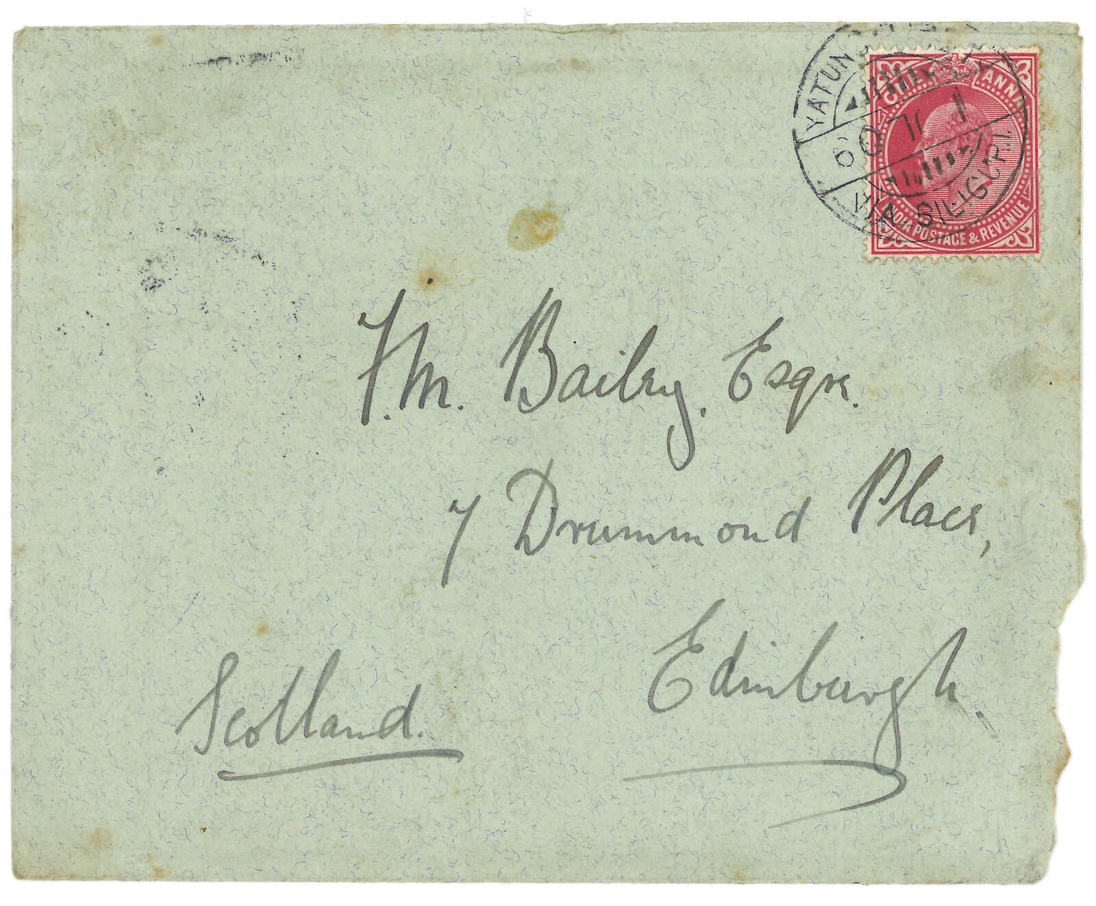 1908.5.28 江孜蘇格蘭的貝利,貼印度愛德華七世半安娜雙連,銷江孜英局日戳。6.5經基地郵局。 抵愛丁堡,改寄約克。出自貝利擔任貿易代表時的書信比1904年侵藏時期的書信更為少見。(Image 1)