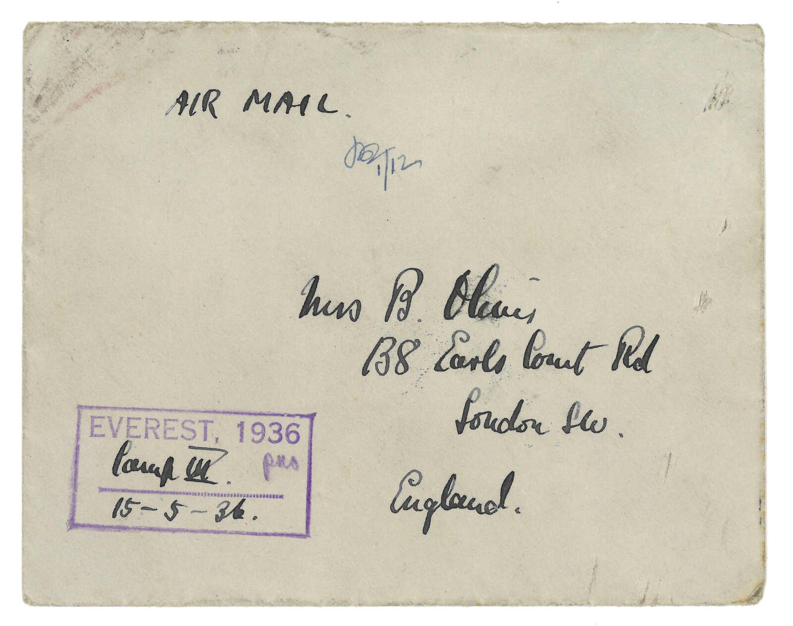 1936年珠穆朗瑪峰登山隊封寄英國,被盜後尋回,鈐有額峰type