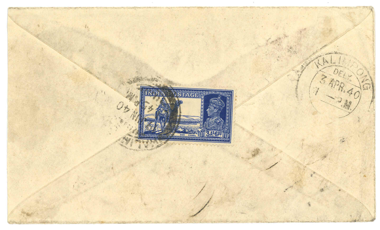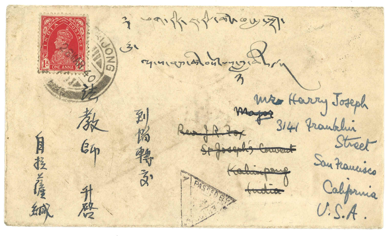 1940.3 帕里宗寄Kalimpong,改寄美國。二戰檢查封,貼印度佐治六世1安娜,銷帕里宗英局日戳。4.3抵Kalimpong。再加貼3安娜6派,銷Kalimpong 6.19日戳以改寄美國。正面鈐三角形檢查章。(Image 1)