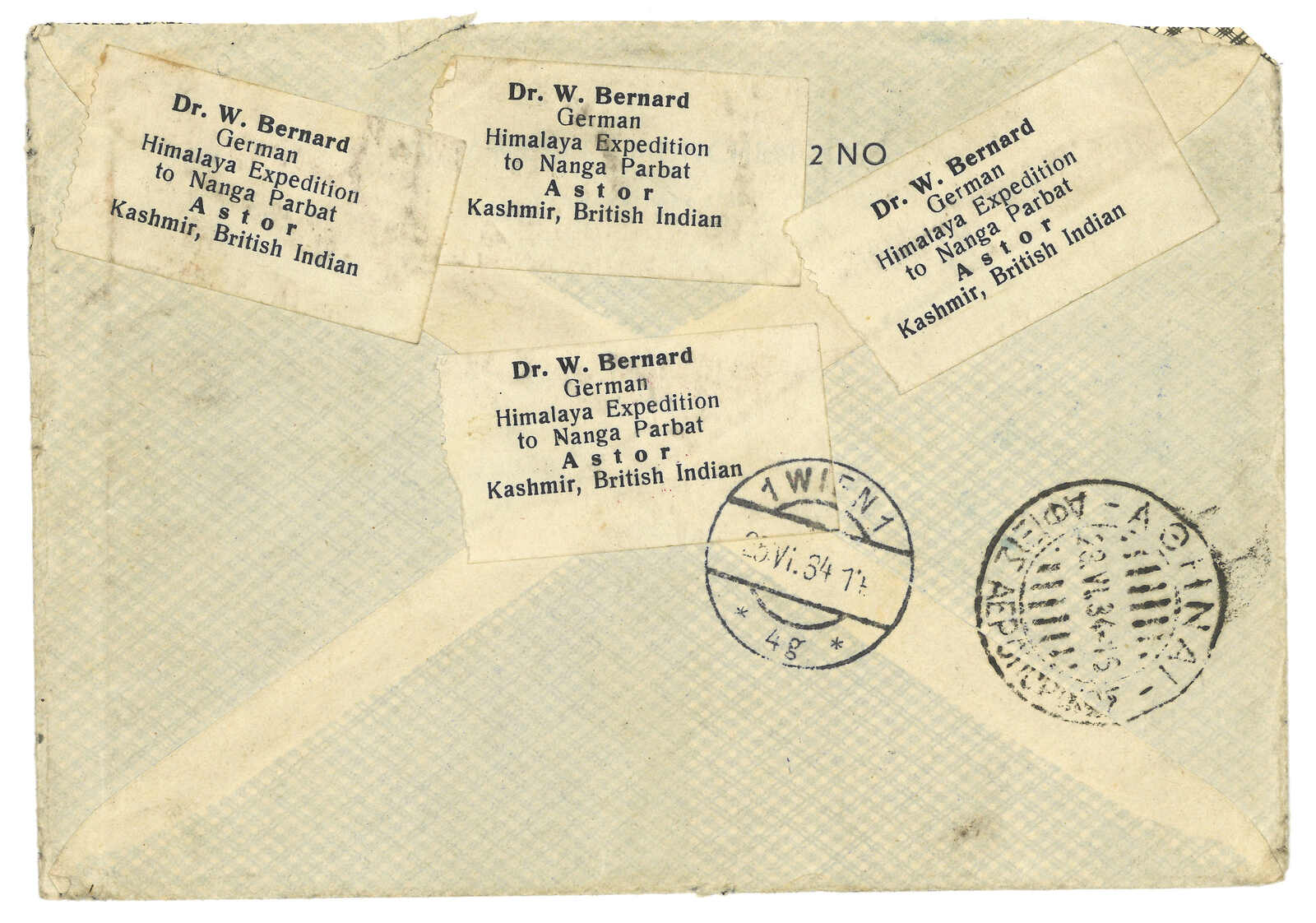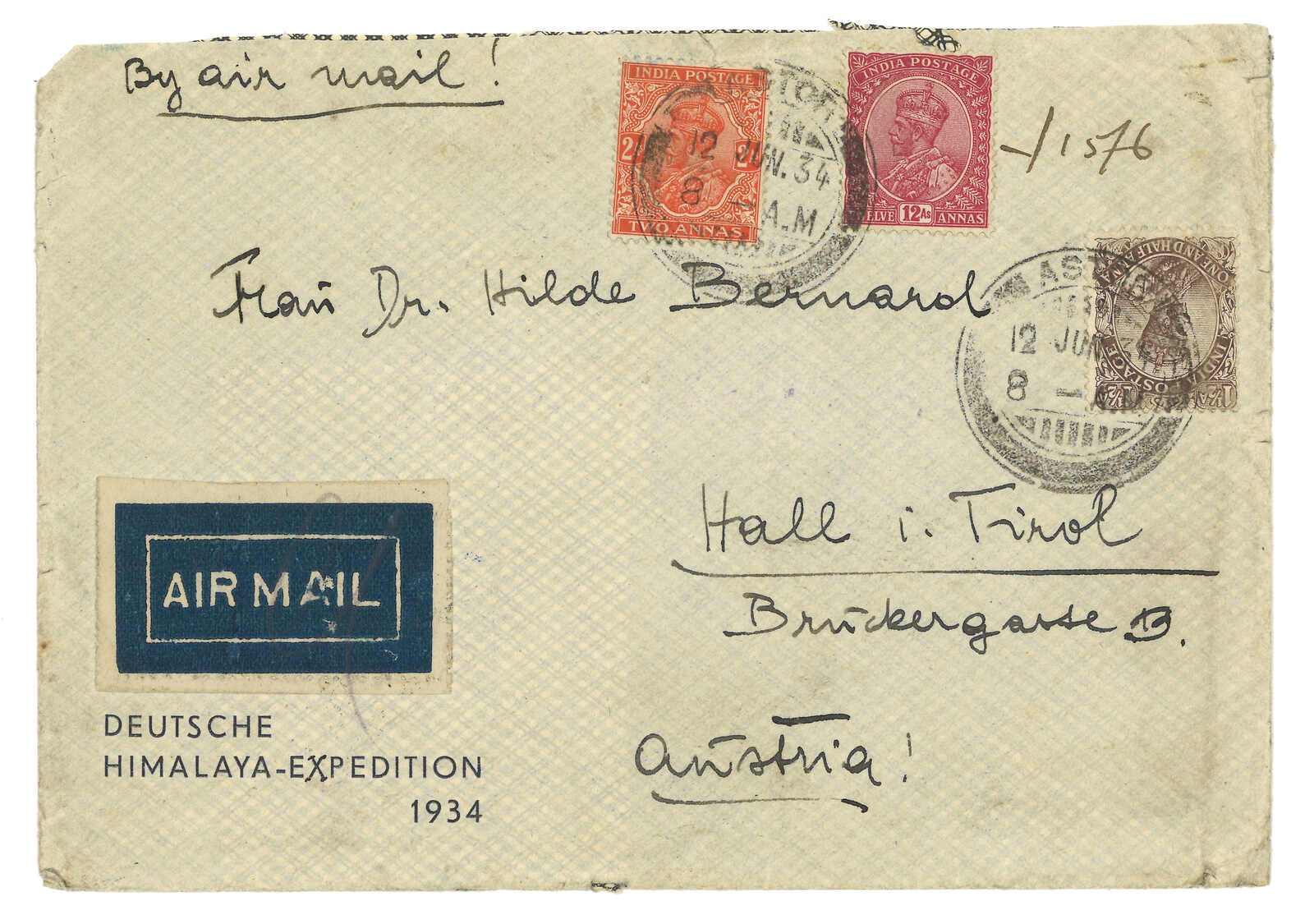 1934.6.12 德國探險隊航空封自Astor寄奧國,貼佐治五世1-1/2安娜 + 12安娜 + 2安娜,銷Astor日戳。6.25抵維也納。背貼有寄件人W Bernard博士之標籤。蔡盛及王劍智著《青康藏郵驛史》第124頁圖例14號原件。(Image 1)