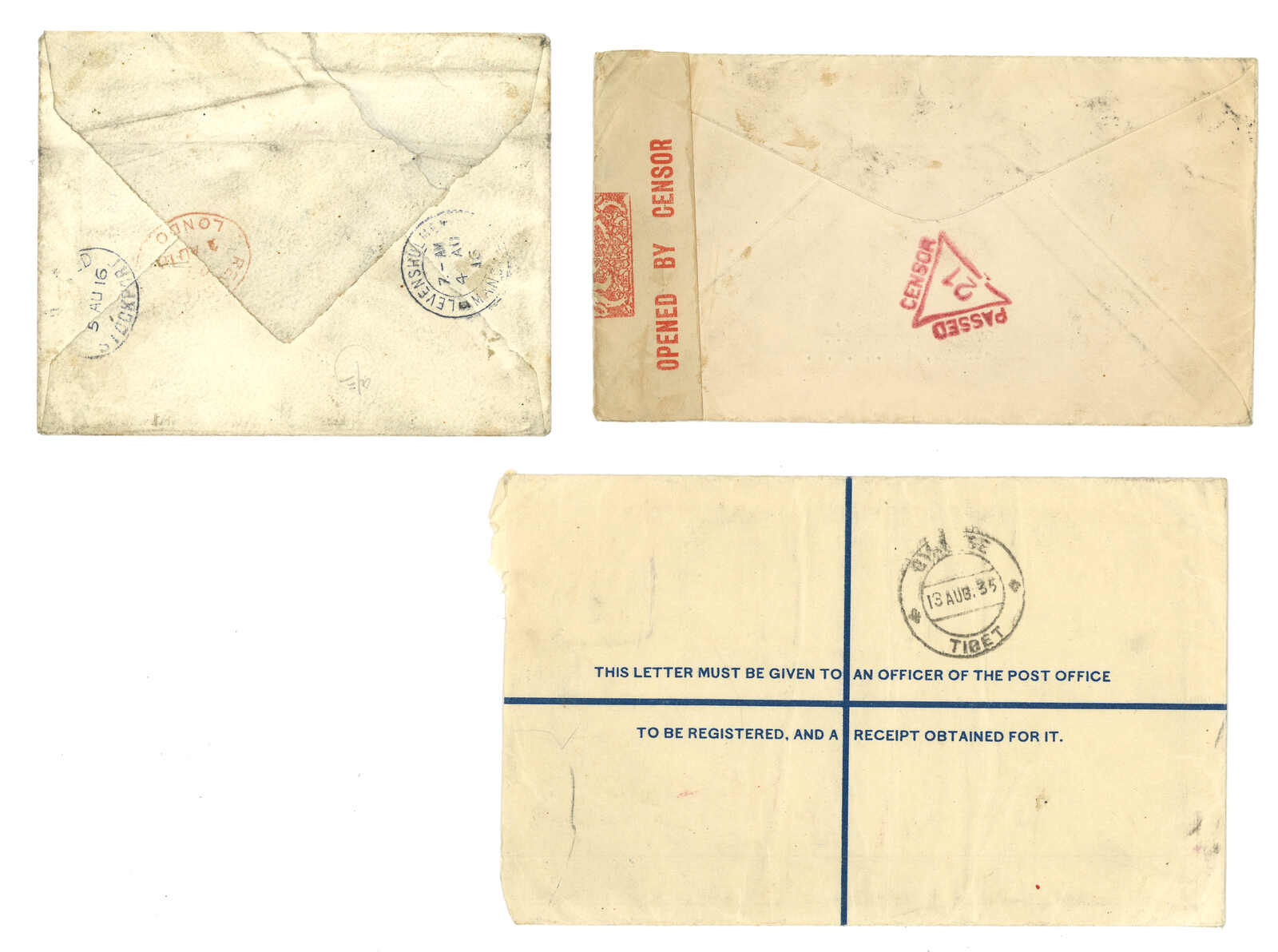 1932年一組三件印度佐治五世1安娜郵資封,分別自甘托克及羌塘寄芬蘭Elli Hertz太太。羌塘位於錫金北部,為英印進軍崗巴宗的路線。(Image 1)