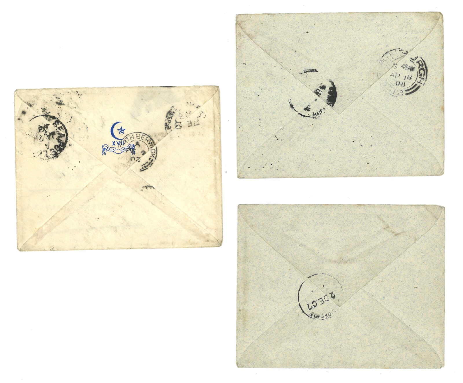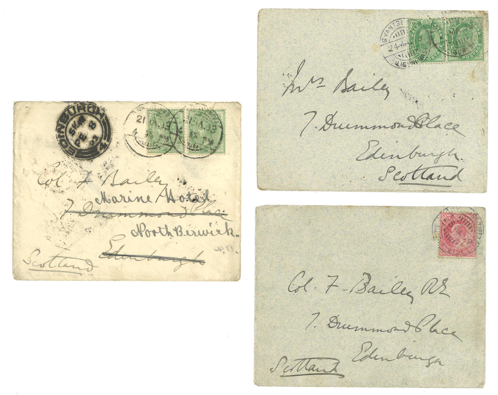 1903至1907年一組三件貝利書信,自江孜寄蘇格蘭,貼印度維多利亞及愛德華七世像票,銷江孜英局日戳。(Image 1)