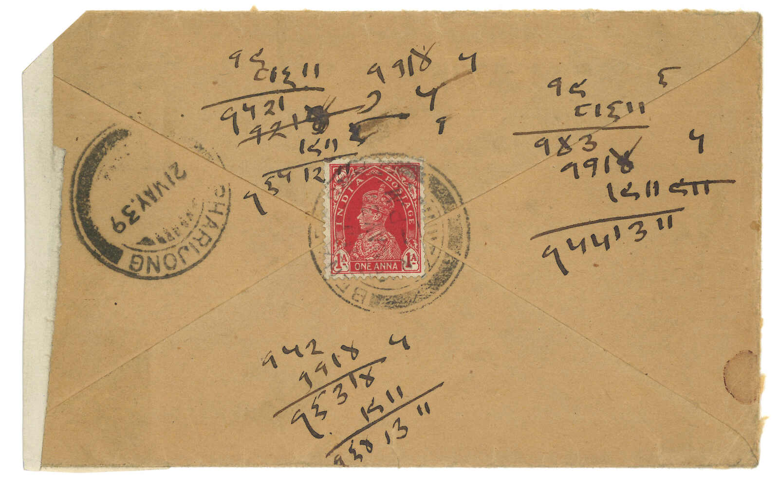 1939年Benares寄拉薩,背貼印度佐治五世1安娜,銷Benares日戳。5.21抵帕里宗英局。正面蓋有偽造之江孜軍郵70局檢查章。傳聞此章由1980年代之郵商臆造。(Image 1)
