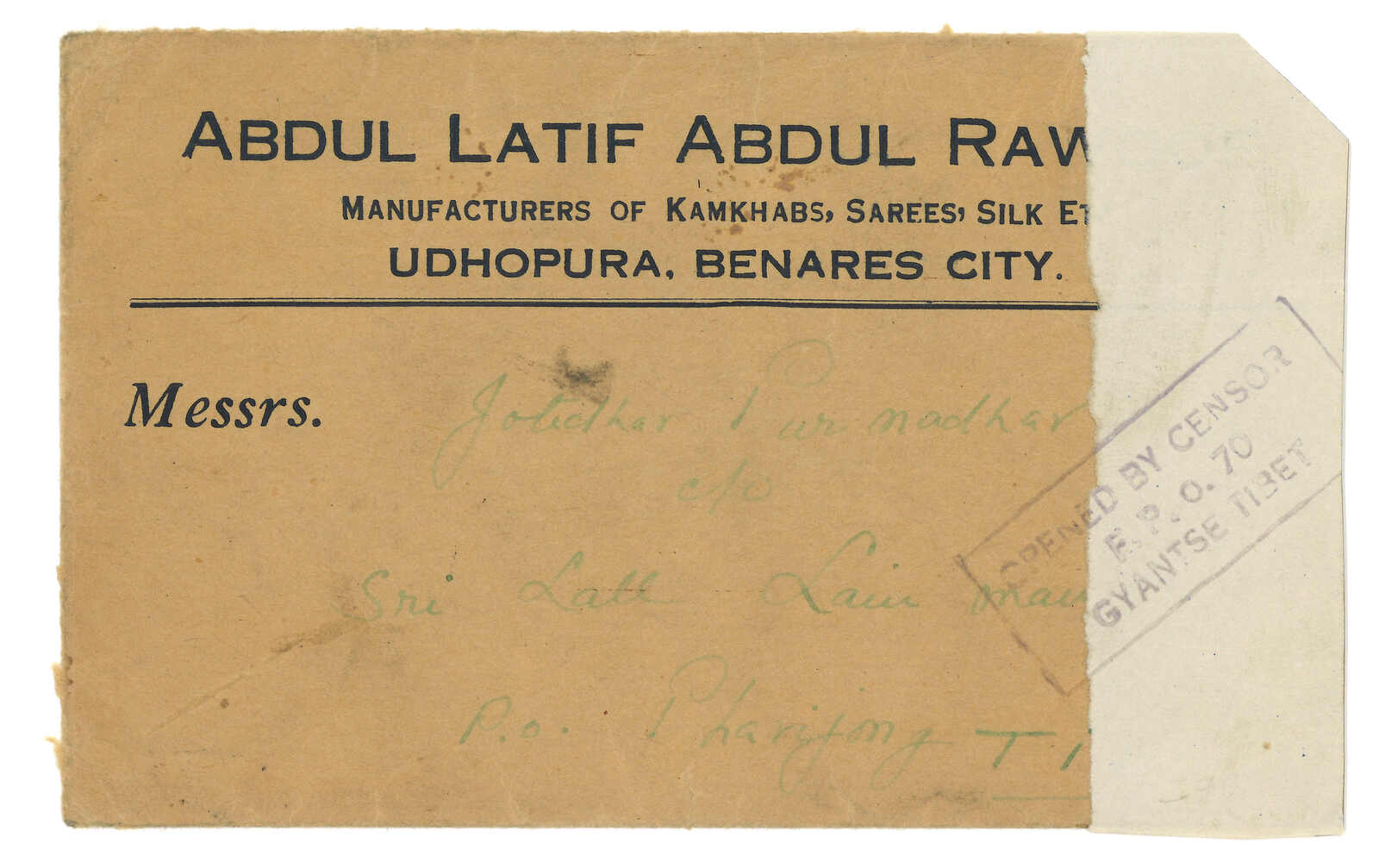 1939 Benares to Lhasa, f.w. Indian KGV 1a on reverse, tied by Benares cds. Arrived Pharijong BPO (21 May). On front with forged "Opened by Censor / FPO 70 / Gyantse Tibet" marking. It is said that this forged mark was created