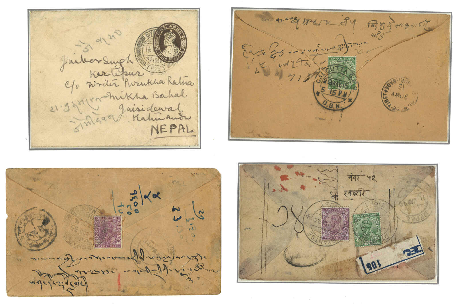 1918至1932年一組四件江孜寄尼泊爾封,貼印度愛德華七世或佐治五世像票,銷江孜英局B1、B2、B4型等日戳,部分旁帶尼泊爾商人戳記及尼泊爾到達戳。(Image 1)