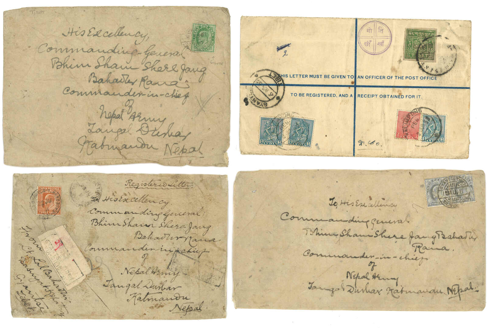 1910至1930年代一組九件江孜英局實寄封,包含掛號、混貼等例子。當中一件寄Bhim Shamshere Jang Bahadur,他於1929年成為尼泊爾首相。(Image 1)