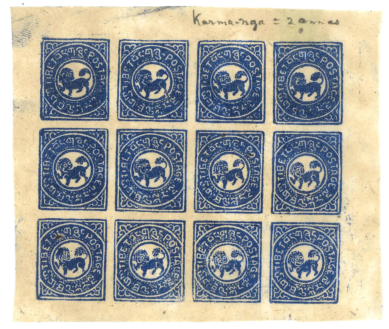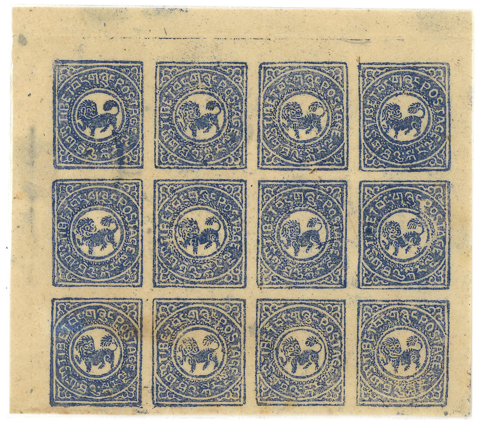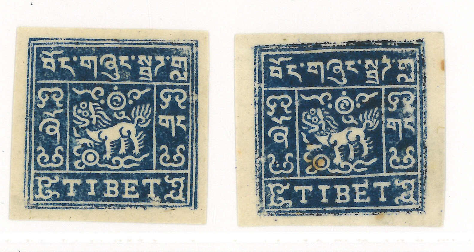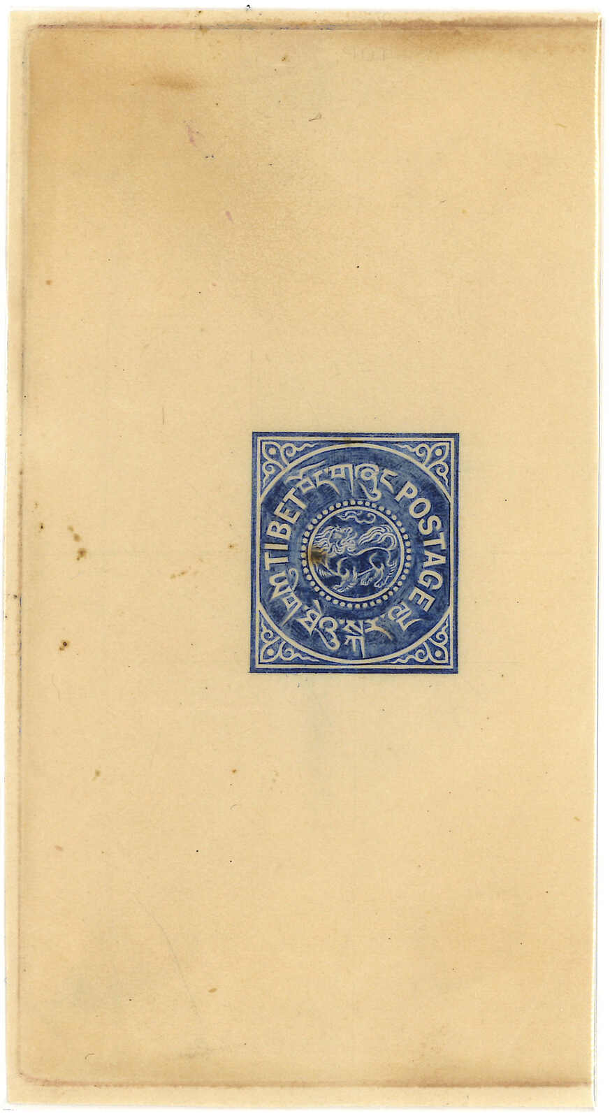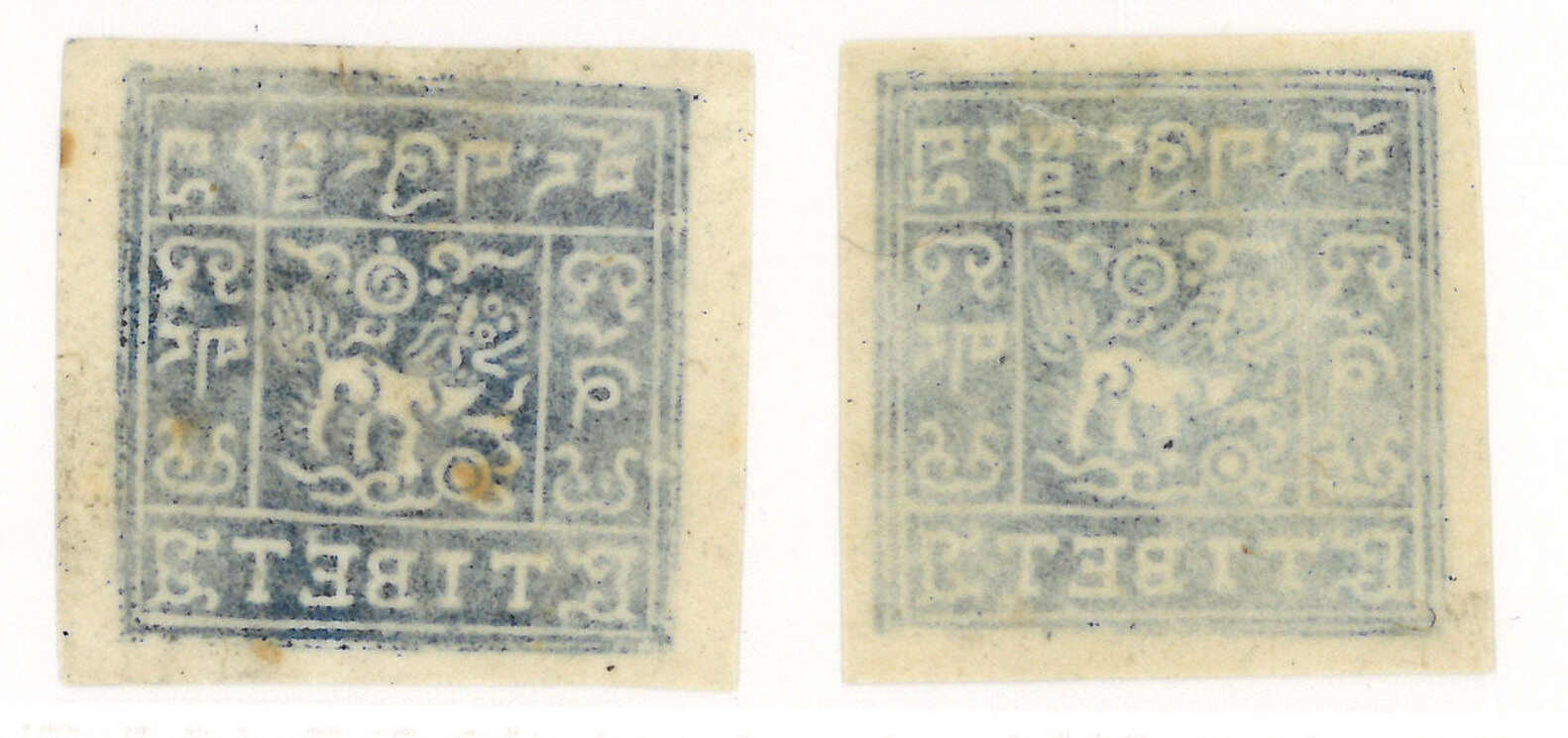 1912年西藏第一版獅圖試樣票,獅首向右。面朝右方的獅子被視為非佛教,故隨後改為正式發行時所見的設計,可見此試樣票何其珍罕。王劍智及蔡盛《青康藏郵驛史》2019年第233頁。(Image 1)
