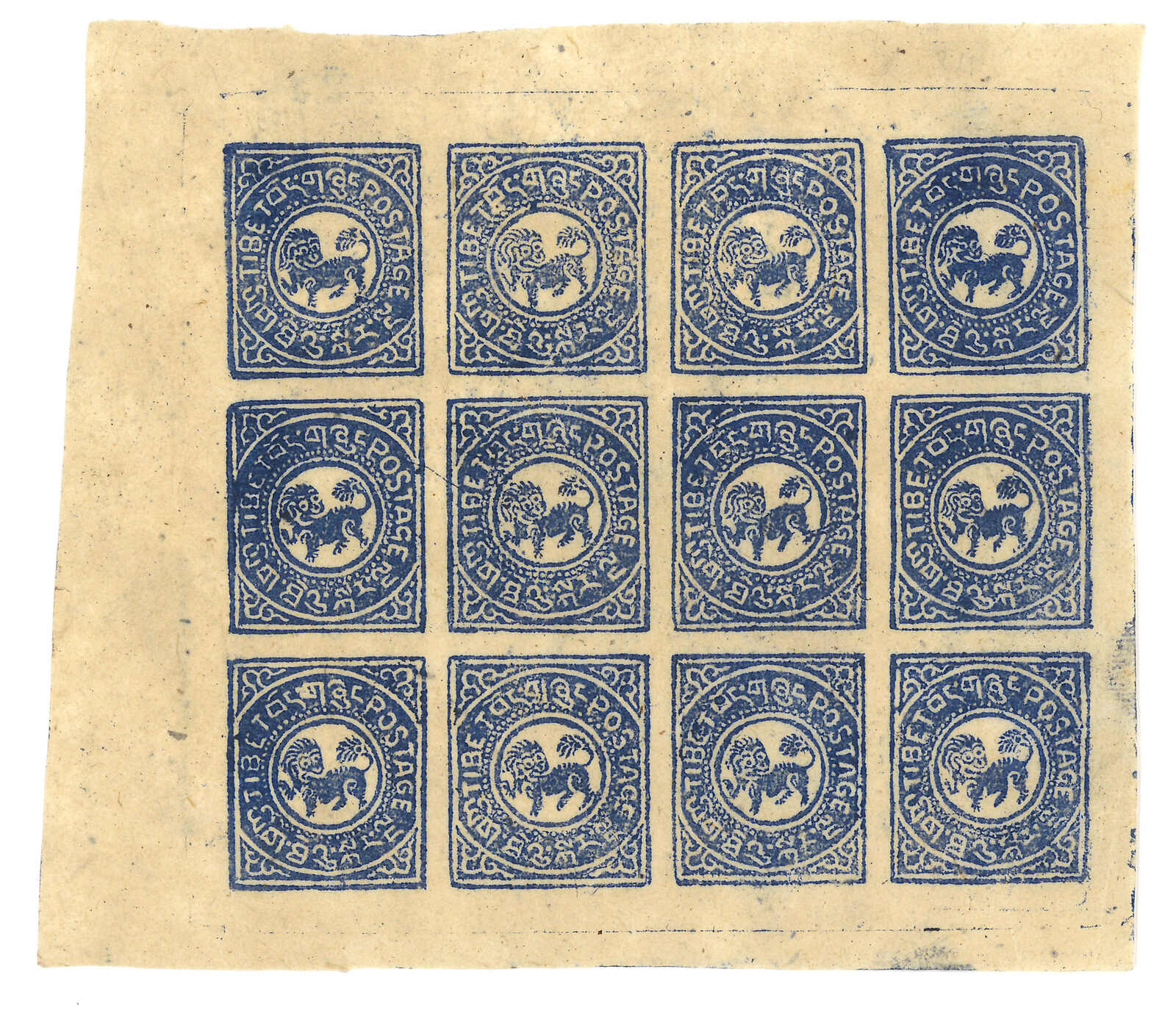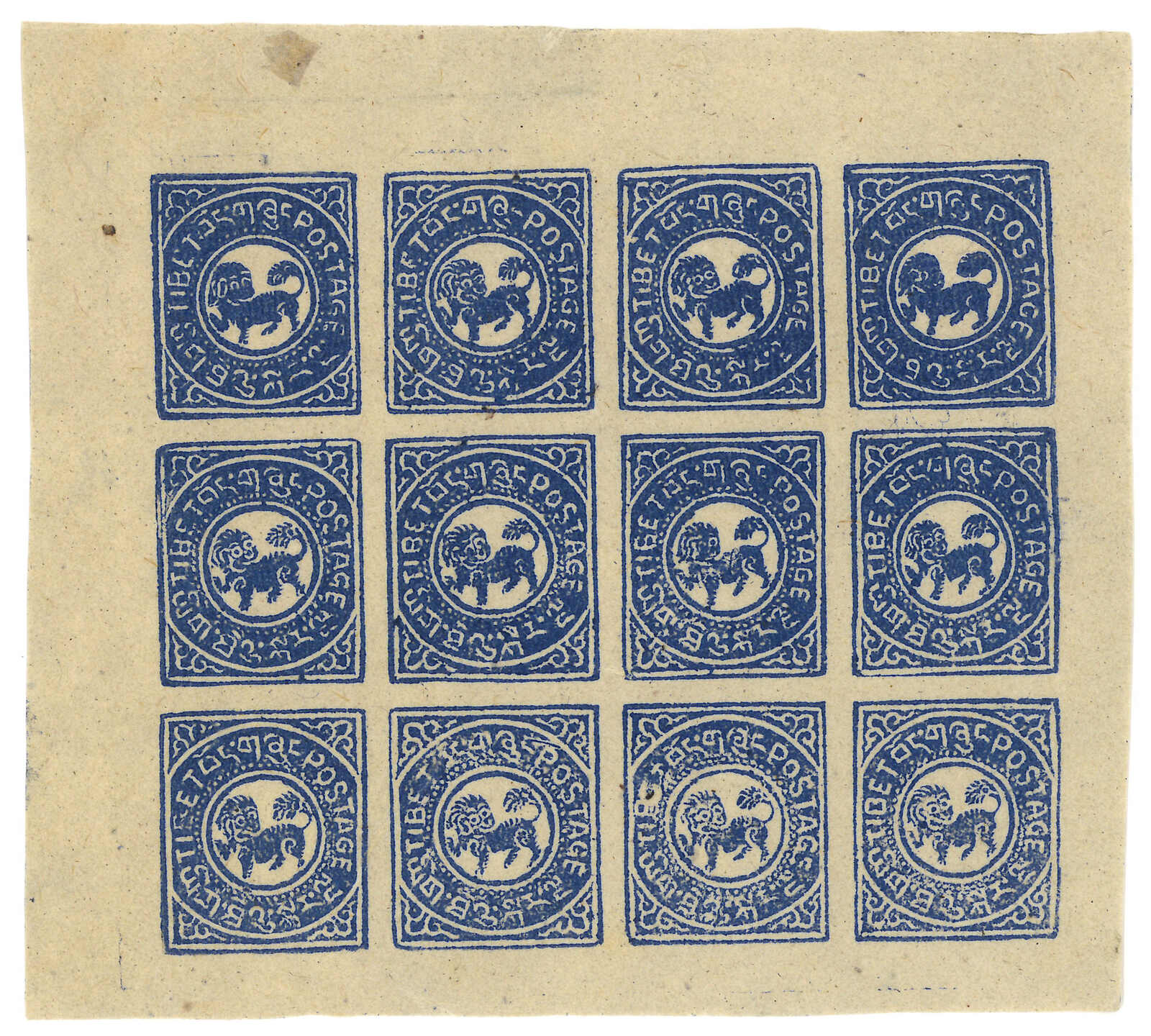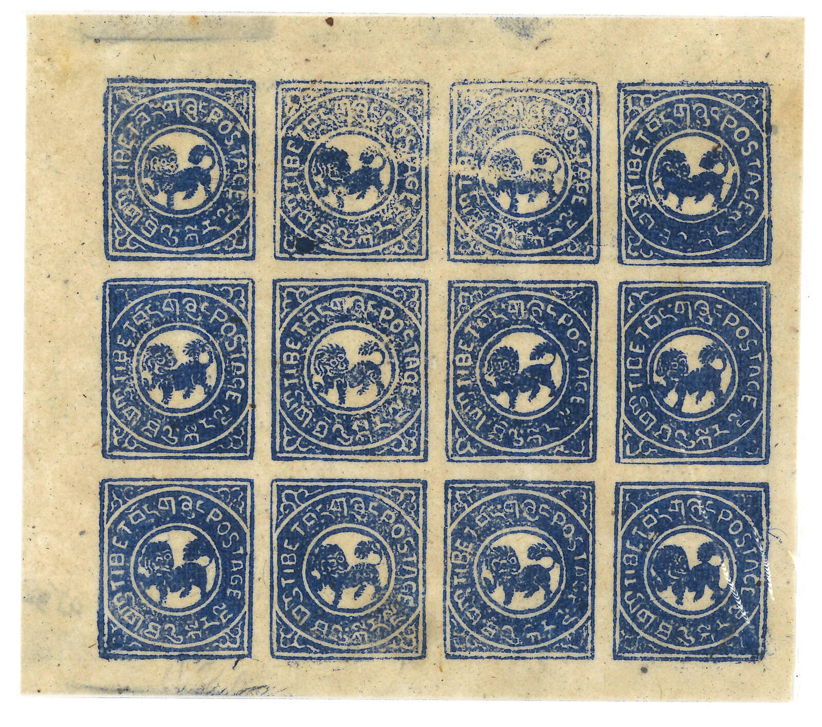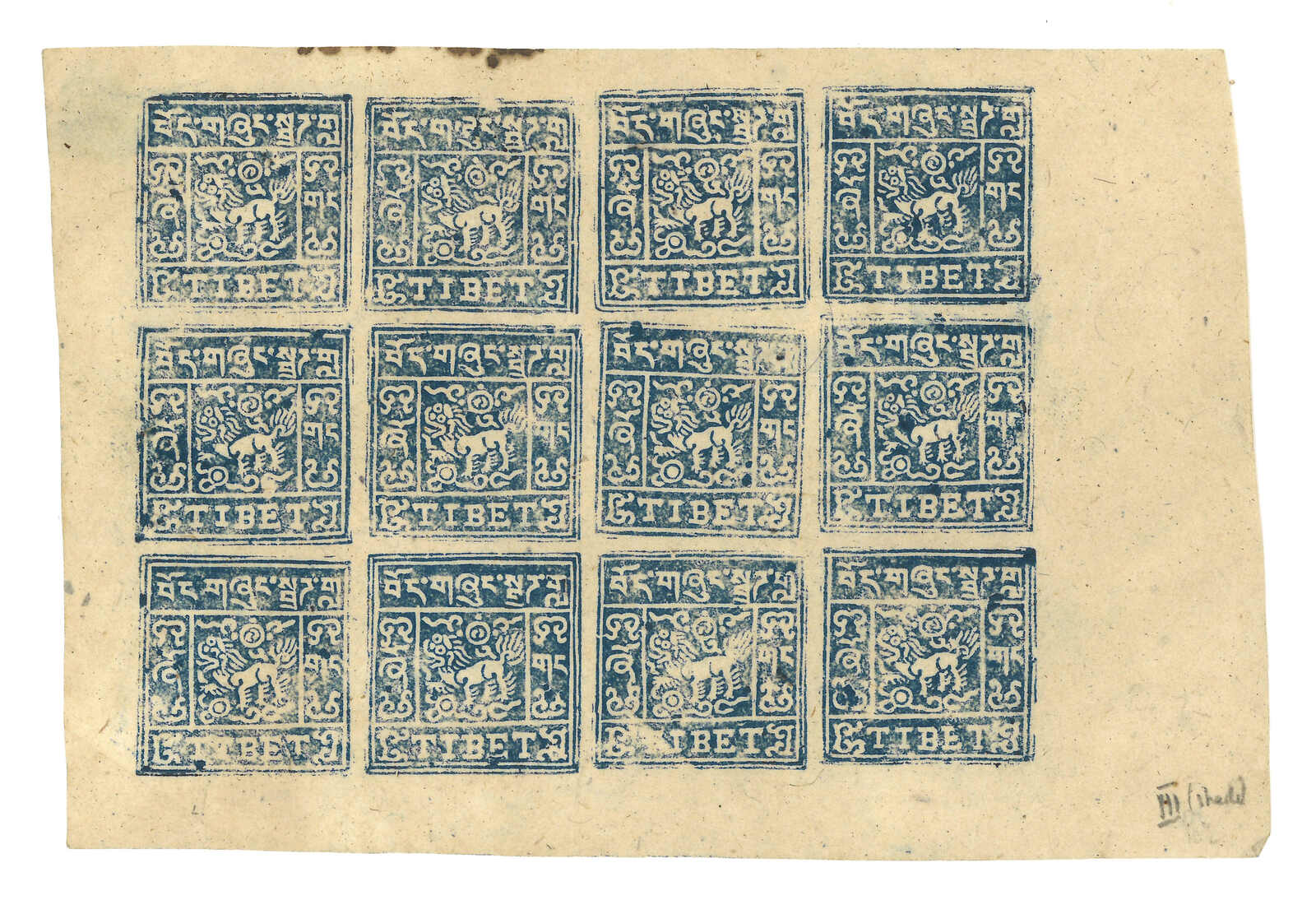 1912年西藏第一版獅圖試樣票,獅首向右。面朝右方的獅子被視為非佛教,故隨後改為正式發行時所見的設計,可見此試樣票何其珍罕。王劍智及蔡盛《青康藏郵驛史》2019年第233頁。(Image 1)