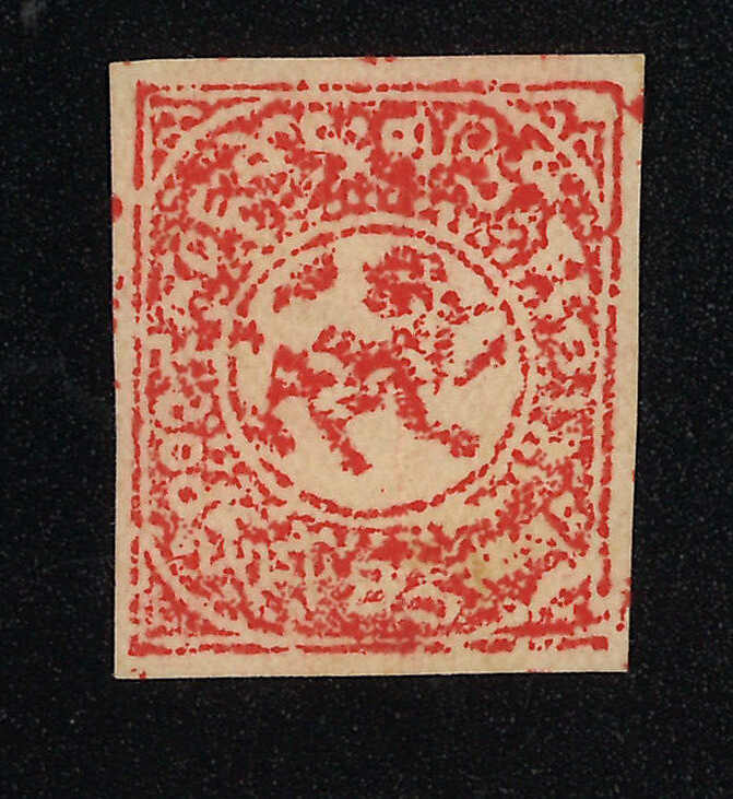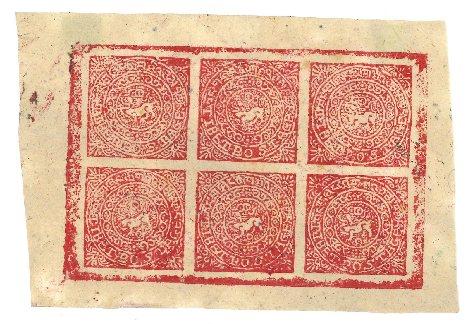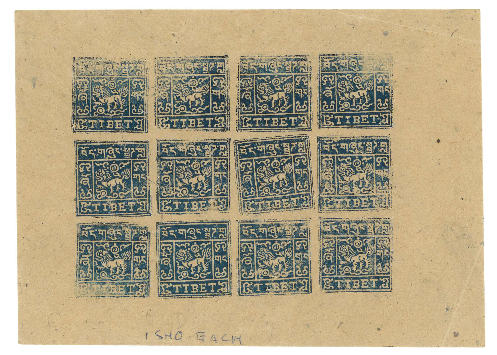 1912 Tibet 1st issue native proof, showing lion facing right which was considered un-Buddhist and thereforewas changed to the more accepted design in official issuance. Extremely scarce. Provenance: Tibet Stampsand Postal