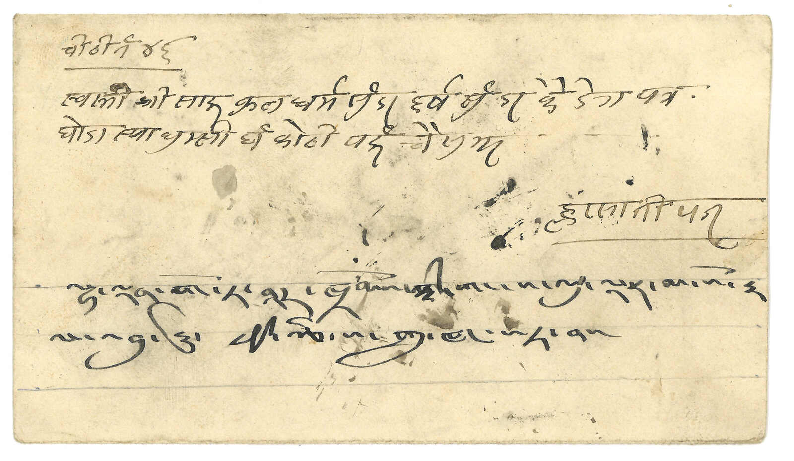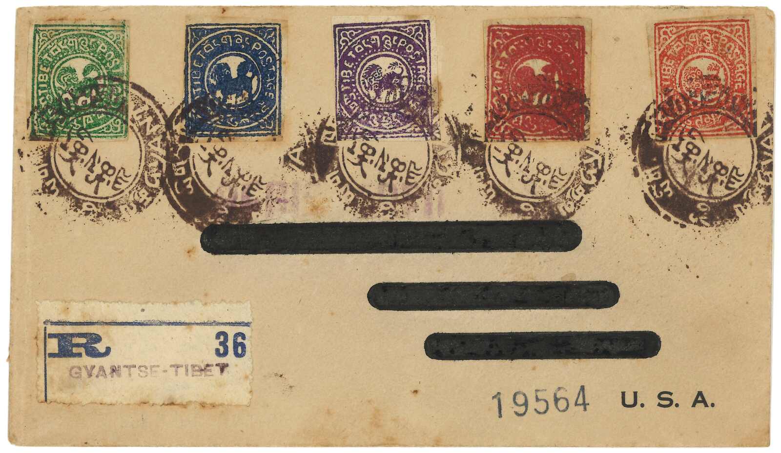 beyond Gyantse” and ”To sender thru DLO Calcutta” annotation. Unclaimed and departed from Gyantse (13 Mar). Arrived Calcutta, transfered to Bombay DLO (18 Apr). As Tibetan stamps were not recognized outside Tibet, incoming mails had to be exchanged